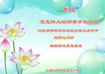 河北省邯郸市永年区全体大法弟子向师父问好! 谢谢师父慈悲苦度! 二零二零年九月二十日 河北省衡水市大法弟子恭祝师父中秋节快乐!