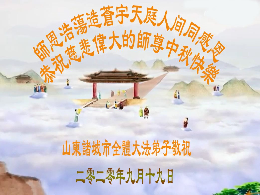 在这值千金值万金的正法最后时刻,弟子谨遵师尊的教诲,修好自己,做好三件事。 在助师正法、救度众生、兑现神圣誓约的通天大道上,勇猛精進,直至圆满。满载众生返天庭。让师尊多一份欣慰!不愧为是创世主的弟子!不愧为宇宙大法造就的神圣生命! 感恩创世主的再造!感恩师尊的浩荡洪恩! 弟子虔诚的叩拜师尊! 跪拜合十 2020年9月19日 山东省潍坊市临朐县全体大法弟子恭祝师尊中秋快乐!