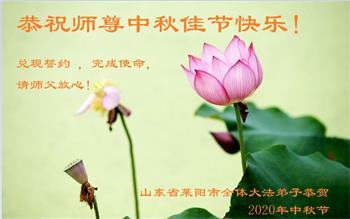 金秋送爽中秋至,每逢佳节倍思亲。在二零二零年中秋佳节即将到来的美好时刻,恭祝伟大慈悲的师尊节日愉快!我们每个大法弟子都知道,是伟大慈悲的师父力挽狂澜,救度苍穹于坏灭的瞬间,师父的洪恩无以言表,唯以精進报师恩。我们知道,师父给每个弟子铺就了功成圆满的路,我们一定遵循师父的教诲,做好“三件事”,圆满随师还。大法的光辉将永远照耀在苍穹中! 山东省聊城市临清市大法弟子祝伟大的师尊中秋节快乐!