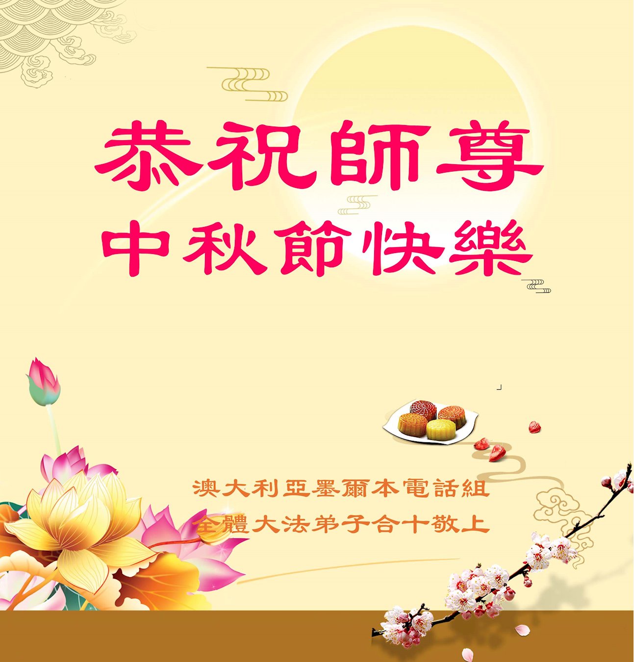 澳大利亚墨尔本电话组全体大法弟子恭祝师尊中秋节快乐!