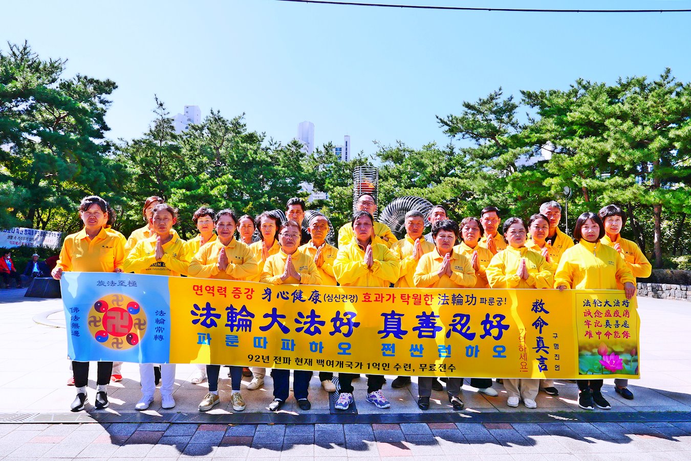 二零二零年九月二十七日,韩国首尔南九老部份法轮功学员在九老公园炼功洪法,向市民展现法轮大法的美好,并向师父致以中秋的问候!