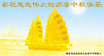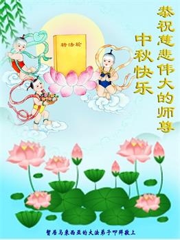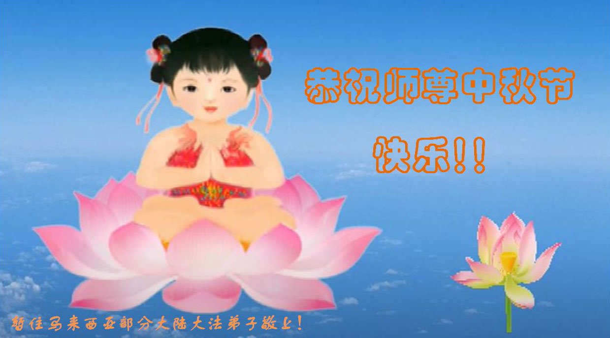 红尘苦海名利忙 师尊唤醒引航向 承受巨难挡险关 日夜未闲护身旁 师尊教诲解迷茫 洗净污垢心亮堂 三字真言铭记心 随师救众不彷徨 感恩师尊寄彼岸 合十叩拜诚敬上 万语千言道不尽 师尊佛恩洪无量 暂居马来西亚吉隆坡的大法弟子恭祝慈悲伟大的师尊中秋节快乐!