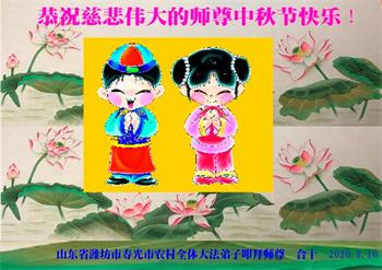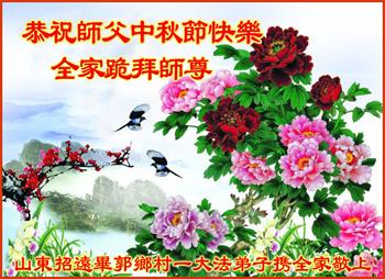 一年一度的中秋节又要来临了,在这即将来临之际,我向师父问好,师父您好,师父您辛苦了!这一年来在师父的慈悲保护下,我三件事也在做,但感觉真正的实修对自己来说不容易,去执着心一层层的非常艰难。但是不管如何,我一定要努力的修下去,做好三件事,不辜负师父对我的期望,让师父少一份操心,多一份快乐!谢谢师父的慈悲救度。 山西省大同市浑源县乡村大法弟子敬上 2020年9月4日 山东省烟台市招远市毕郭乡村一大法弟子携全家恭祝慈悲伟大的师父中秋节快乐!