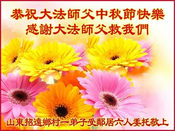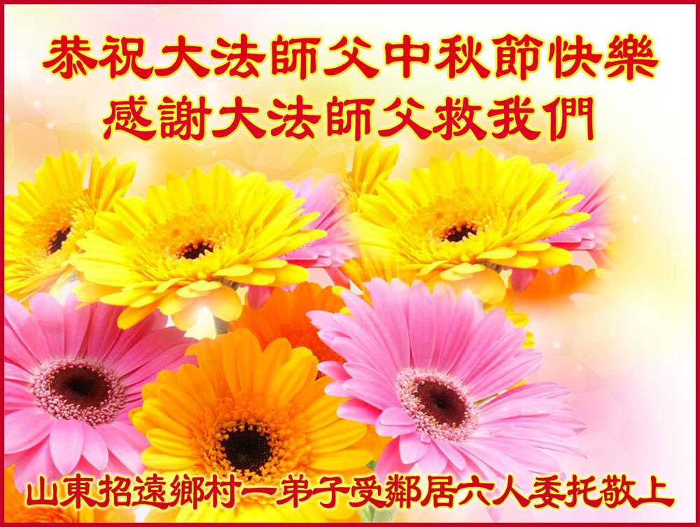 通过学法炼功做三件事,弟子才懂得了什么是真修。弟子要努力修好自己,多救众生,跟上正法進程,圆满随师还! 谢谢师父的慈悲救度! 山西省大同市浑源县乡村大法弟子敬上 2020年9月8日 山东省烟台市招远市乡村一大法弟子受两户邻居六人委托恭祝大法师父中秋快乐!