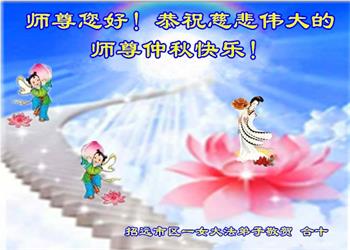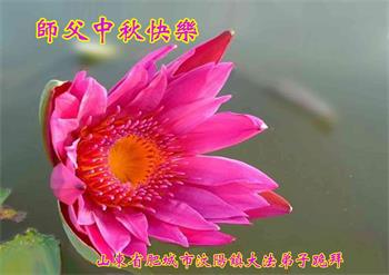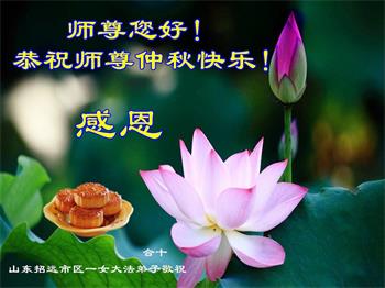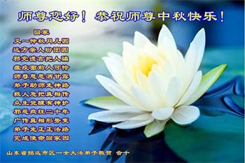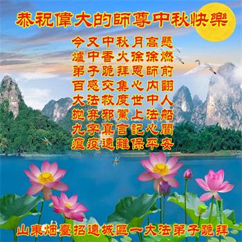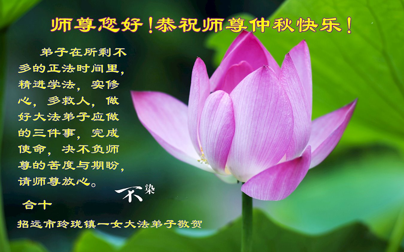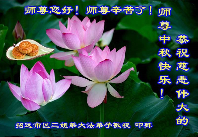 师尊您好!弟子祈盼着早日见到师尊! 是师尊给了弟子生命的希望,使弟子沐浴着佛光,每天都生活的充实和幸福!弟子一定珍惜这万古不遇的珍贵机缘,努力做好三件事,让更多的生命明白真相,给自己一个得救的机会。 弟子感恩师尊慈悲救度!合十! 山东省威海市一学法小组大法弟子恭祝师尊中秋快乐!