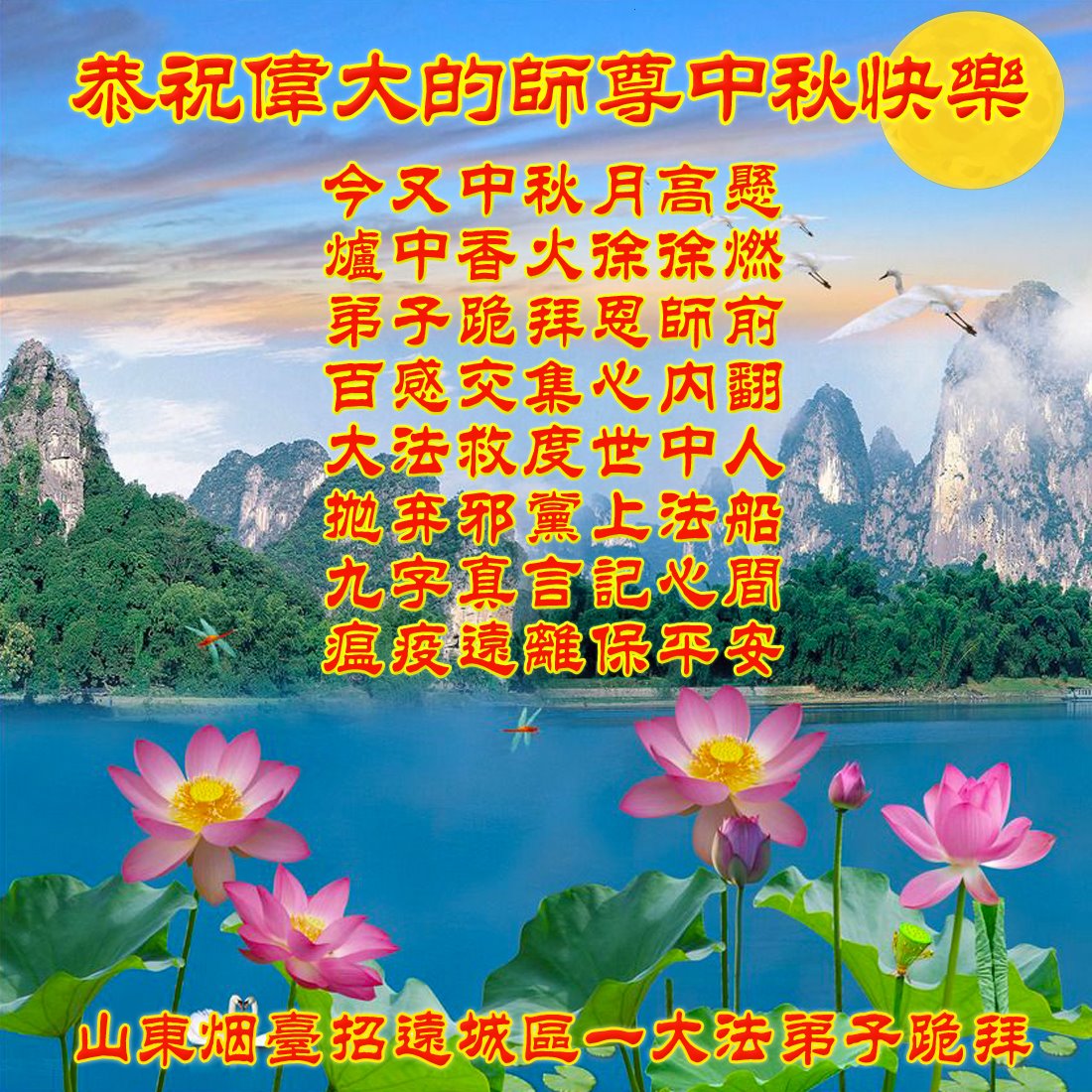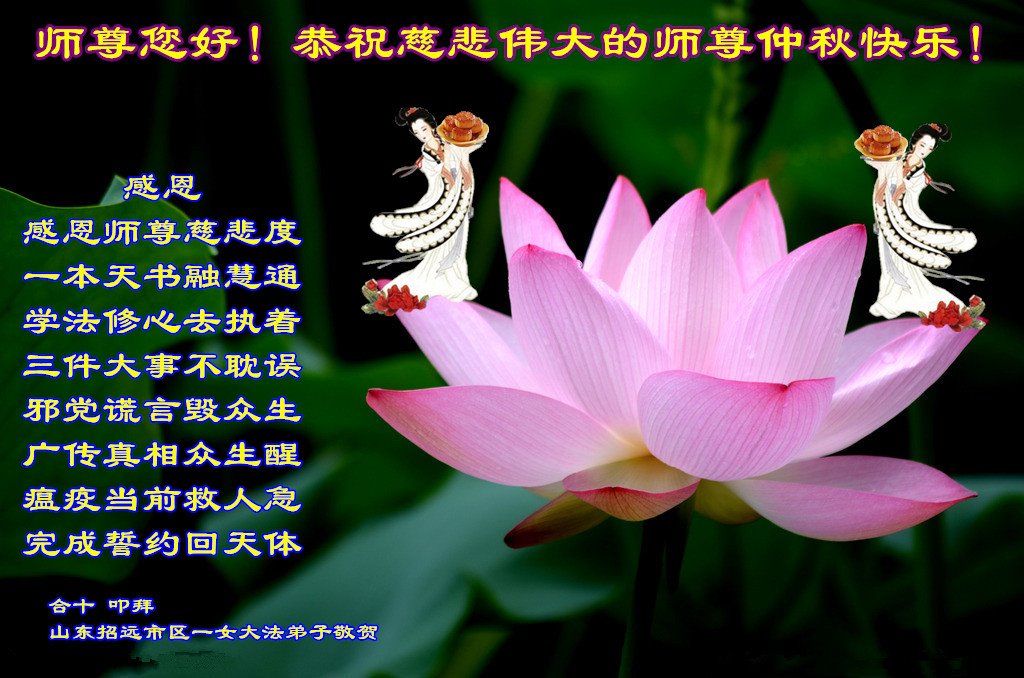 师尊您好!恭祝慈悲伟大的师尊中秋快乐! 感恩 感恩师尊慈悲度 一本天书融慧通 学法修心去执着 三件大事不耽误 邪*党-谎言毁众生 广传真相众生醒 瘟疫当前救人急 完成誓约回天体 合十叩拜 山东招远市区一女大法弟子敬贺 二零二零年九月 山东省烟台市招远市区一大法弟子恭祝师尊中秋快乐!