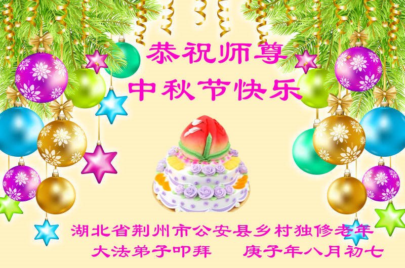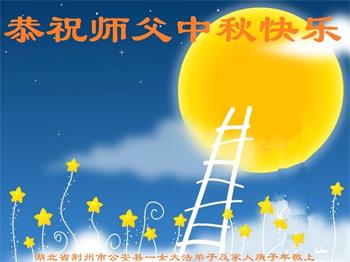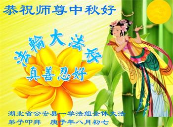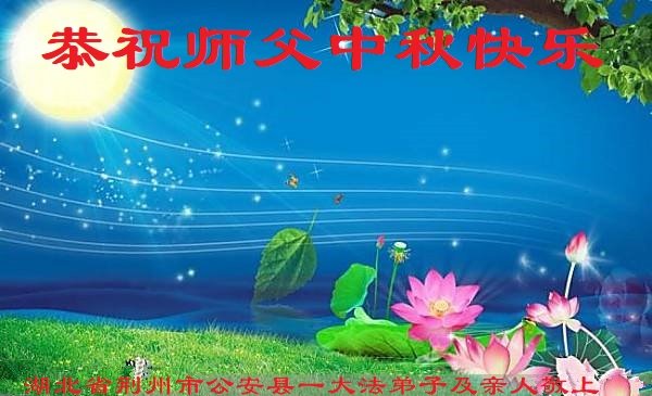 尊敬的师父:您好! 我们湖北公安县学法小组大法弟子对师父感恩之心,无法用语言表达,唯有做好三件事,实修自己,才能报答恩师,跟师父早日回家。 再次恭祝师尊中秋快乐! 湖北省荆州市公安县一学法小组大法弟子恭祝师父中秋快乐!