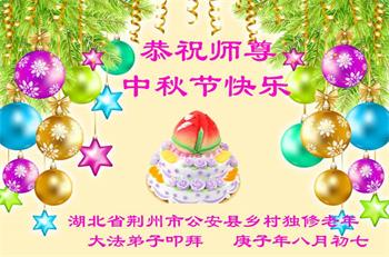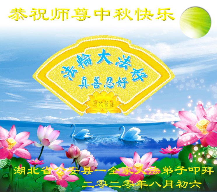 我是湖北省咸宁市崇阳县一大法弟子,在这一年一度的中秋佳节即将来临之际,我首先代表我们全家恭祝慈悲伟大的师父中秋快乐!感恩师父对我们全家所有人的眷顾,我们家人都在大法的护佑下得了福报。感谢师父一次次救弟子于危难之中,师恩难报,我只有做好三件事,修好自己多救人,让师父少操心,最后跟师父回家! 湖北省荆州市公安县全体大法弟子恭祝师尊中秋好!