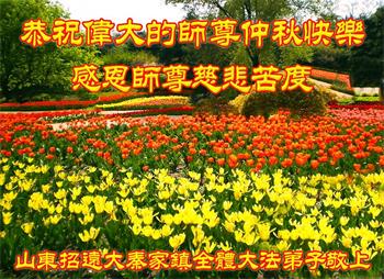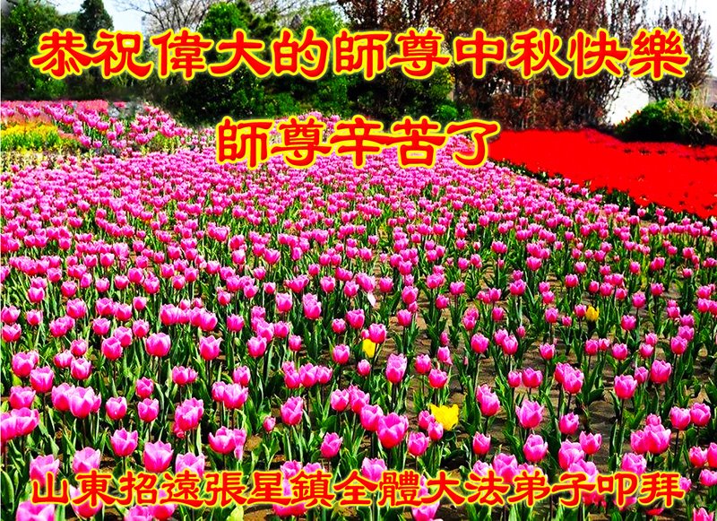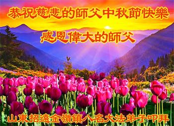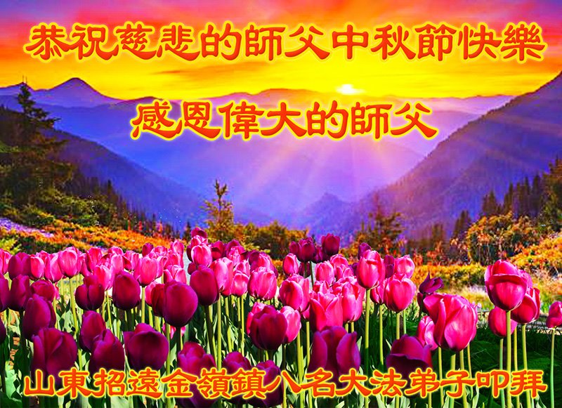 正法初期,因大法对祛病健身有奇效,修炼者道德回升明显。我镇有关村委曾在广播上号召村民们都向法轮功学员学习。大法洪传在我镇出现过鼎盛时期。迫害开始后,我们没有被吓倒,坚持修炼,不间断的做着三件事。我们决心跟随师尊修炼到底,请师父放心!感恩师尊慈悲苦度! 山东省烟台市招远市金岭镇八名大法弟子恭祝师父中秋节快乐!