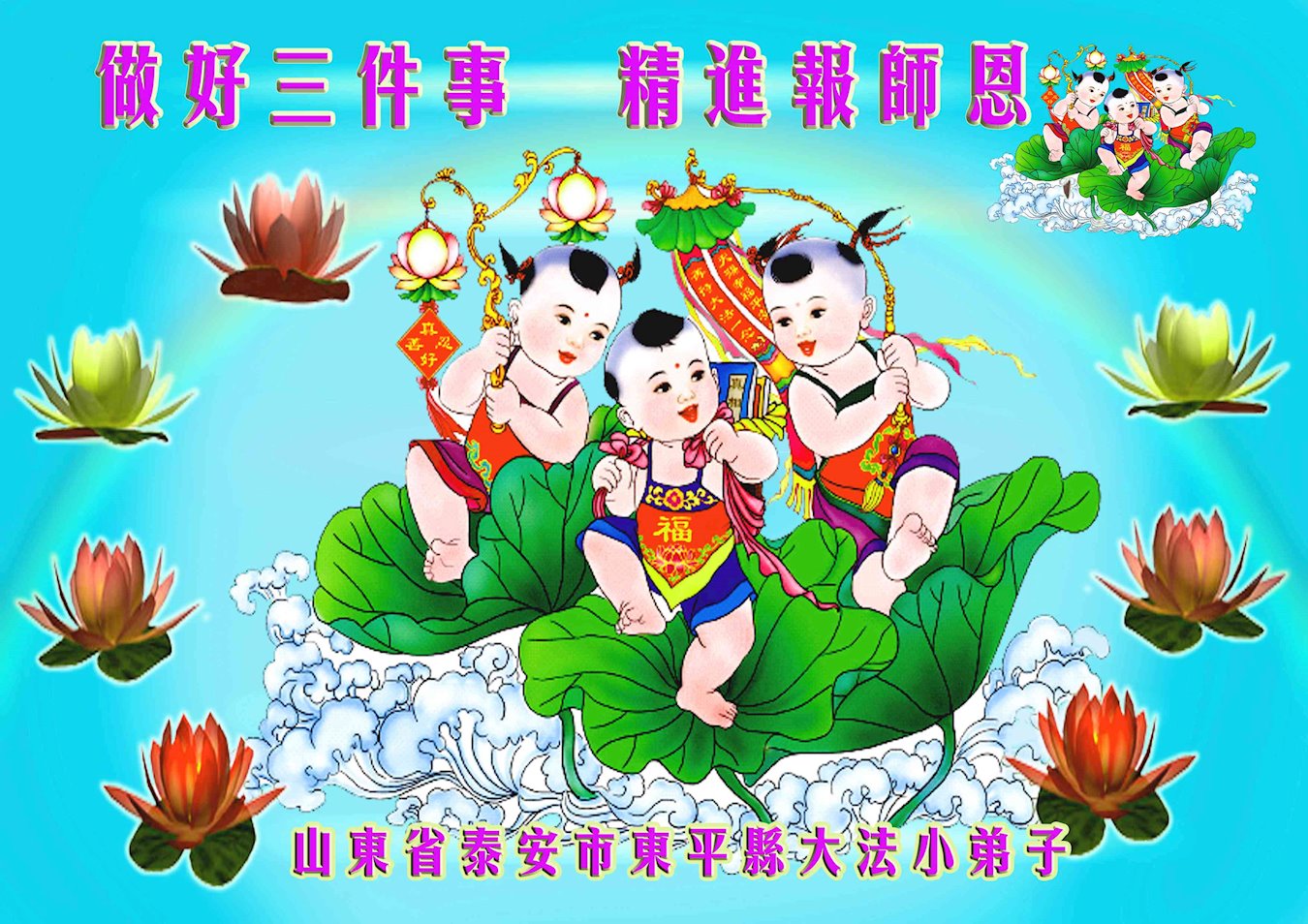 师父您好!师父您辛苦! 我们跟随师父走过了二十多年的修炼路程,一直坚信师父,坚信大法。在法理的指导下,我们经过不断的向内找,不断的提高心性,从一个满身业力无比肮脏的人,变成了一个做事能为别人着想,心胸宽广的好人。在师父的慈悲保护下,在法中我们成熟起来了,对师父的大恩大德,我们无法报答,唯有好好修炼,在修好自己的同时,抓紧时间多救人,用心完成我们的使命。 感恩伟大的师父!叩拜伟大的师父! 山东省烟台市招远市张星镇全体大法弟子叩拜师尊!师尊辛苦了!