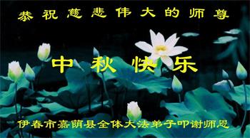 弟子叩谢师尊慈悲救度,弟子们一定做好三件事,兑现誓约跟师尊回家。 伊春市翠峦区一家大法弟子敬上 黑龙江省伊春市嘉荫县全体大法弟子恭祝师尊中秋快乐!