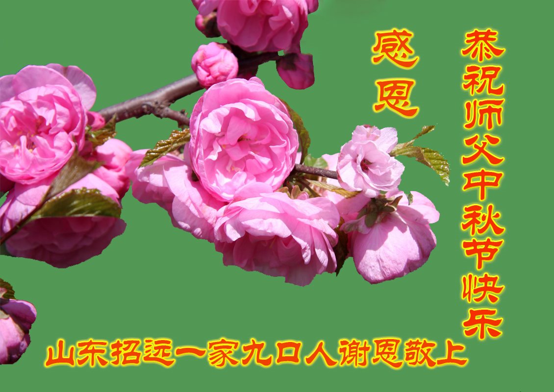 尊敬的师父您好!师父您辛苦了!我们全家四代人都有幸生在大法洪传时代,有幸闻听这万古难遇的高德大法,有幸被师父慈悲保护和救度,感到无比的骄傲和殊胜。我们全家人都相信大法和支持大法,我们知道大法不是一般的法,是真正来救度众生的真法、好法,伟大的佛法!我们全家人感恩伟大的师父!虔诚的叩拜慈悲伟大的师父!恭祝慈悲伟大的师父中秋节快乐!我们非常想念师父,盼早日能见到师父。 山东省烟台市莱阳市一家五名大法弟子代表全家八口人恭祝慈悲伟大的师尊中秋佳节快乐!