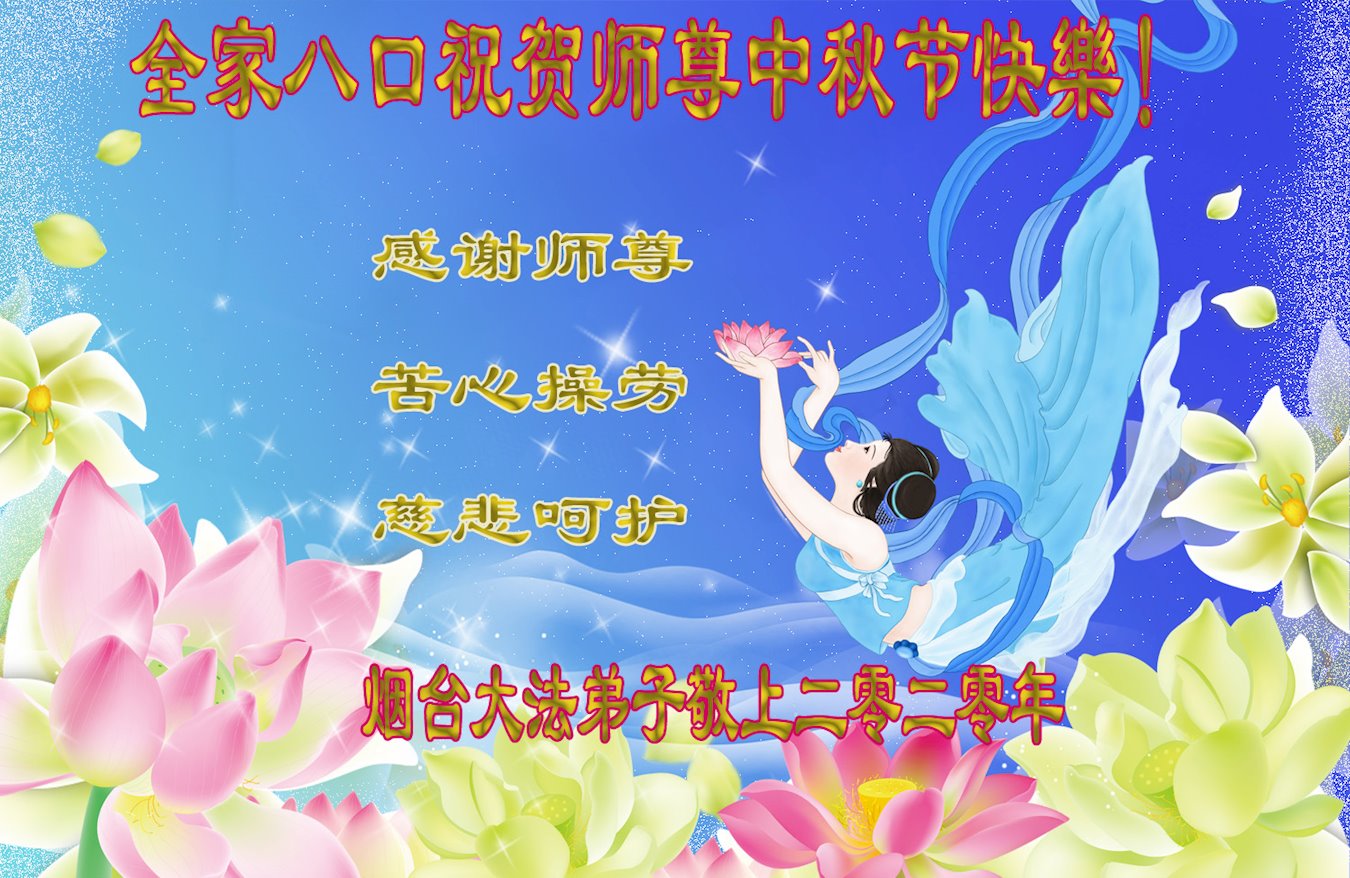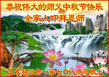 感谢师父慈悲救度,告诉我真、善、忍的法理,让我沐浴在大法中,走上返本归真之路,修炼成一个全新的生命。 弟子从今以后,好好学法,包容世人,讲好真相多救人,遇事向内找。扎扎实实的修好自己,不愧于正法时期大法弟子的伟大称号。 山东省招远市老年大法弟子敬上 山东省烟台市招远市大法弟子一家九口人恭祝师父中秋节快乐!