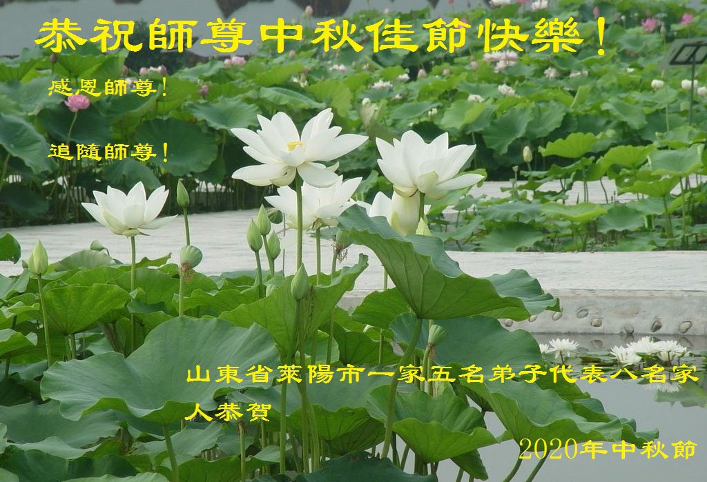 慈悲伟大的师尊您好:您辛苦了!中秋节又到了,我们学法小组全体大法弟子恭祝师尊中秋节快乐!人常说,每逢佳节倍思亲,弟子想念师父,弟子今天与未来的一切都是师尊赐予,感谢师尊慈悲教导弟子如何做人,如何做一个更好的人。真正做好三件事,精進实修,返本归真,跟师父回家。 山东烟台芝罘区大法弟子敬上 2020.9.24 山东省烟台市招远市一学法小组大法弟子恭祝慈悲伟大的师父中秋快乐!