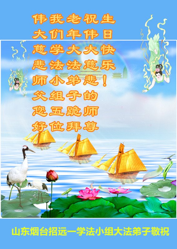 中国传统的中秋节,是全家团圆的节日,在此节日之际,我们老俩口和全中国千千万万的大法弟子一样想念师父,盼望师父能早日回中国,师徒大团圆。 师父,请您放心,无论正法修炼时间还有多少,我们都会一心一意的跟定师父走到底,决不会动摇我们信师信法的心,因为我们知道大法的珍贵和师父的伟大。我们今生能得到这个高德大法,真是太幸运了!大法救了我们的命,我们也会象珍惜自己生命一样珍惜大法。维护大法。 谢谢尊敬的师父! 山东省烟台市招远市一老年大法弟子恭祝师尊中秋节快乐!