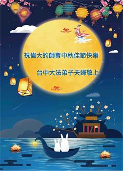 台湾澎湖老年大法弟子恭祝师尊中秋节快乐!我会在法中不断的归正自己,救度更多有缘的众生,不辜负师父的慈悲苦度,珍惜师尊用巨大付出延续来的宝贵时间,做好讲清真相、救度众生的事情。合十 台中大法弟子夫妇恭祝师尊中秋佳节快乐!