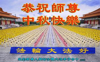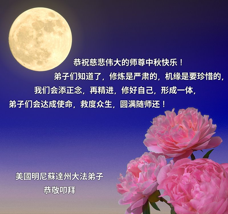 月到中秋分外明 亿万法徒颂师恩 二十四载转眼过 洪恩浩荡难诉尽 弟子牢记师教诲 勇猛精進多救人 待到真相大显时 跟紧师尊回天庭 美国美中母子大法弟子恭祝师尊中秋快乐!