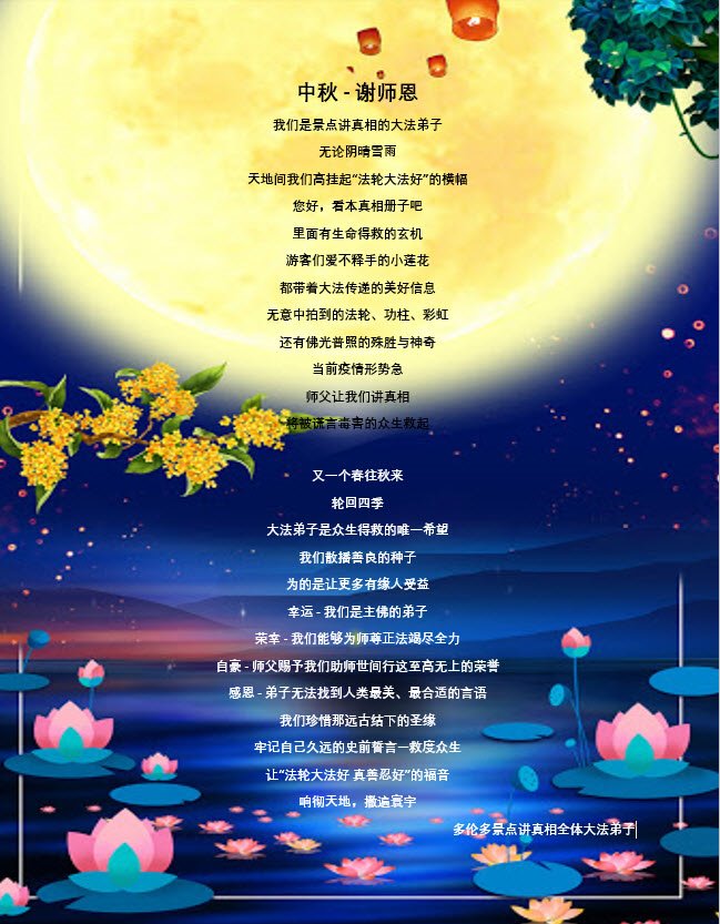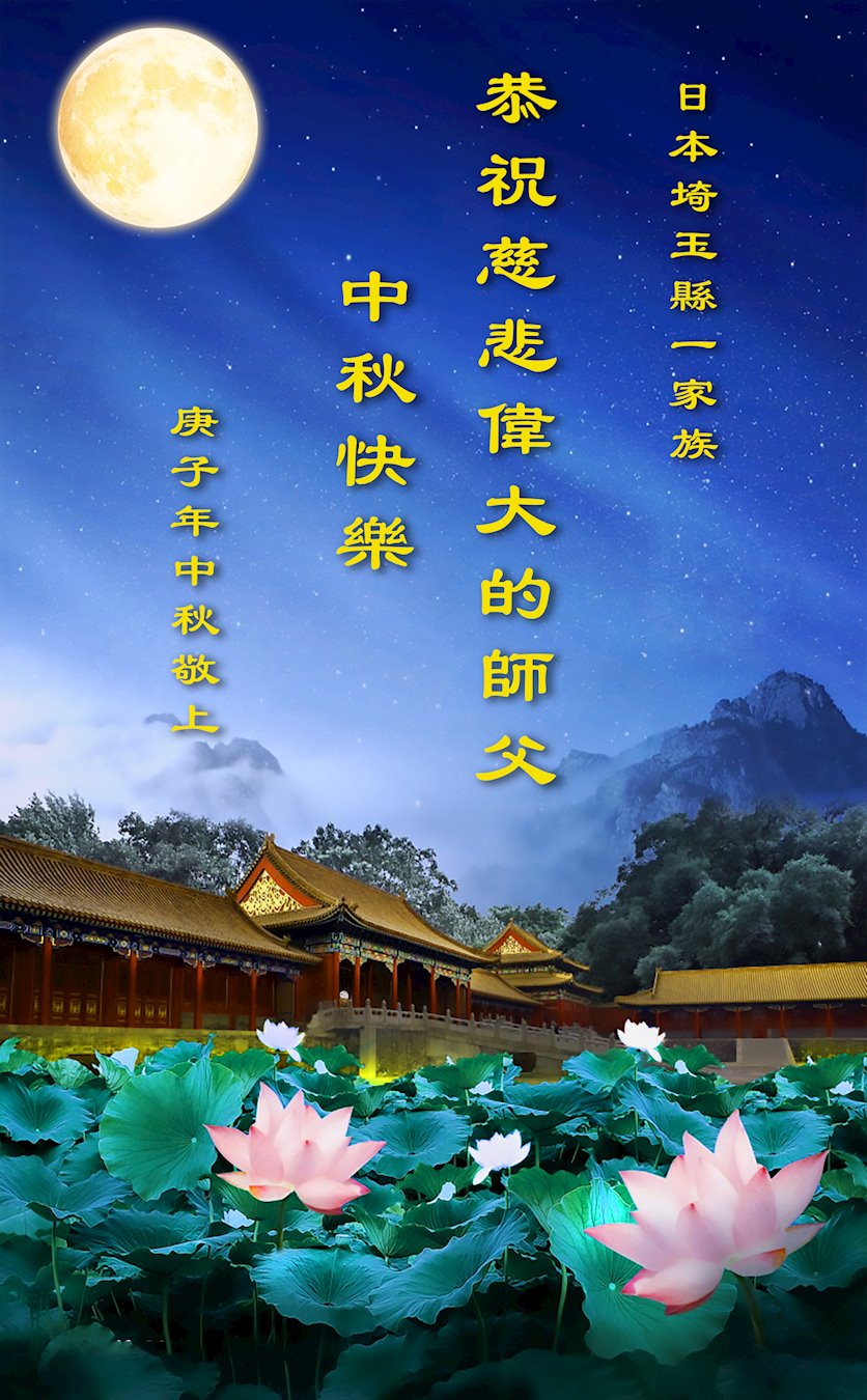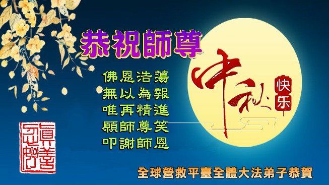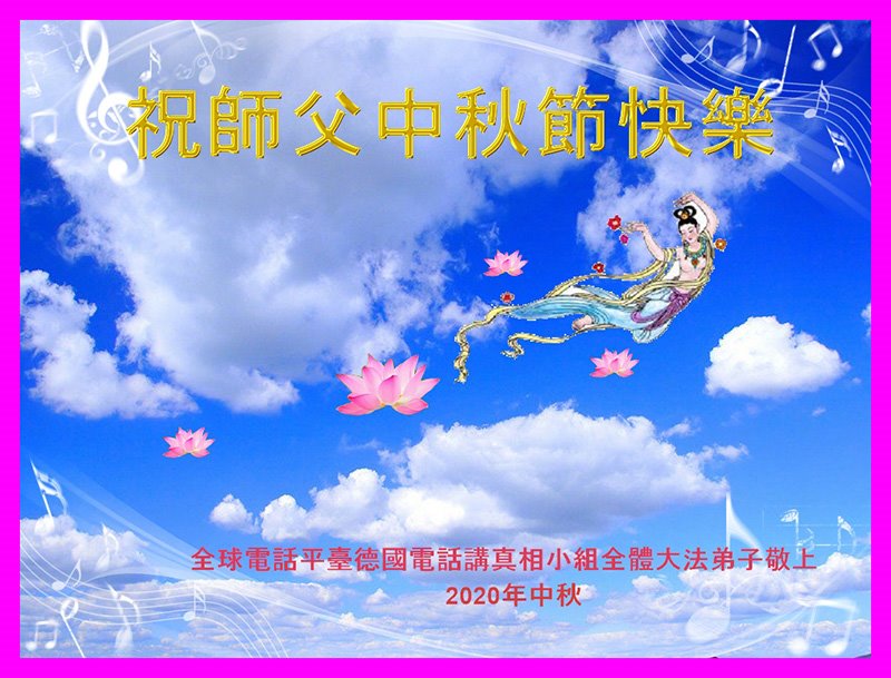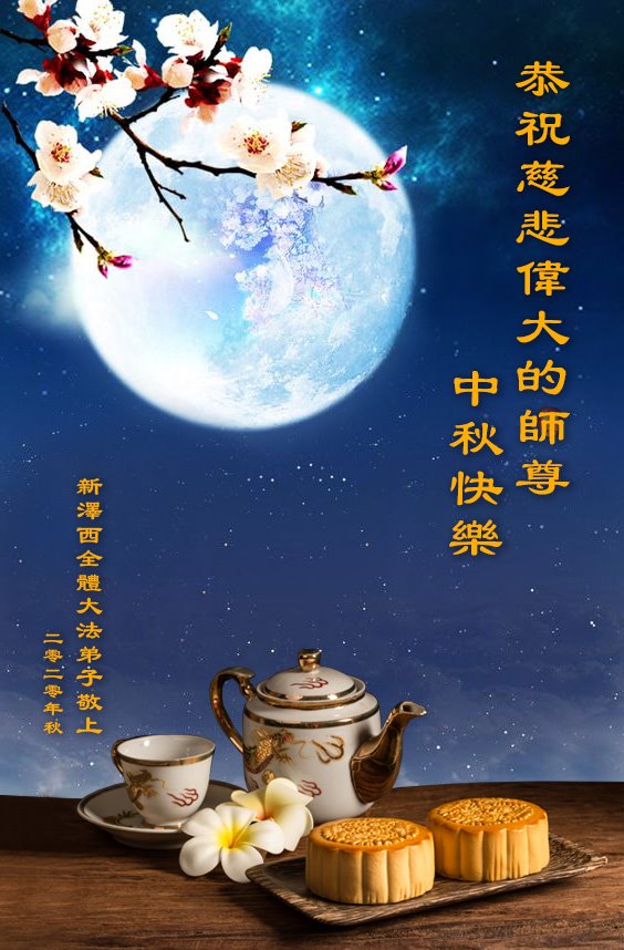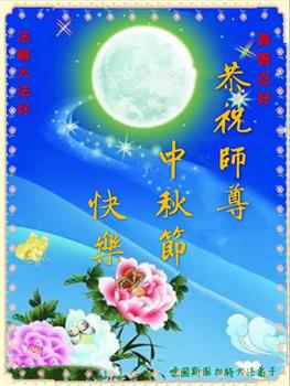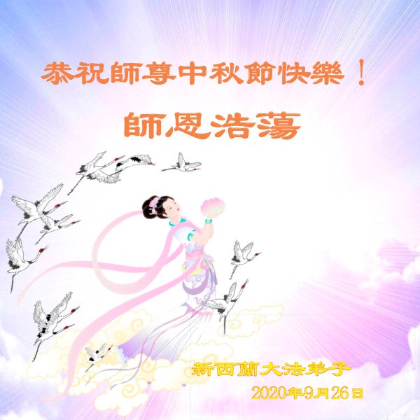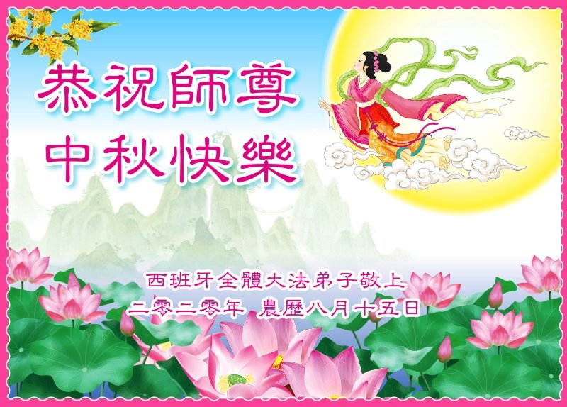 【明慧网二零二零年十月一日】明月何皎皎 合十问师好 末劫大难到 世人不知险 真相解迷雾 救众脱深渊 师笑众生还 天阙舞新莲在2020年中秋佳节之际,世界各国、坚守于各地洪传大法、讲真相的大法弟子们叩谢师父!恭祝师父中秋节快乐! 以下为部份来自美国、瑞典、马来西亚、日本、越南、秘鲁、加拿大、芬兰、巴西利亚、奥地利、俄罗斯、德国、英国、比利时、捷克、斯洛伐克、韩国、法国、荷兰、台湾、印度尼西亚、以色列、澳大利亚、新西兰、瑞士、乌克兰、西班牙、塞浦路斯等各国各地区的大法弟子敬献师尊的中秋贺词。“我们会勇猛精進学好法,修好自己,同化大法,做好大法弟子的三件事,兑现誓约,不辜负师尊的慈悲救度!” 西班牙全体大法弟子恭祝慈悲伟大的师父中秋快乐!美国纽约全体大法弟子恭祝师尊中秋快乐!捷克和斯洛伐克全体大法弟子恭祝慈悲伟大的师尊中秋节快乐!全体以色列大法弟子恭祝师父中秋节快乐!韩国RTC电话组全体大法弟子恭祝慈悲伟大的师尊中秋快乐!日本新宿真相点全体大法弟子恭祝师尊中秋节快乐!纽约时代广场真相小组大法弟子恭祝师尊中秋节快乐!中秋节到了,弟子恭祝师尊节日快乐!在正法的最后时刻,珍惜这所剩不多的时间,做好弟子该做的一切,是师尊对我们的期望,弟子珍惜这一切! 俄罗斯大法弟子恭祝慈悲伟大的师尊中秋节快乐! 秘鲁大法弟子恭祝师尊中秋节快乐!