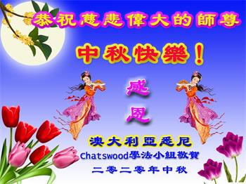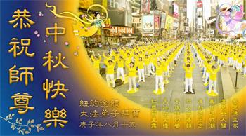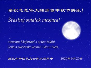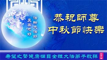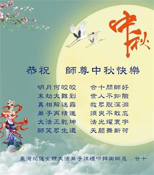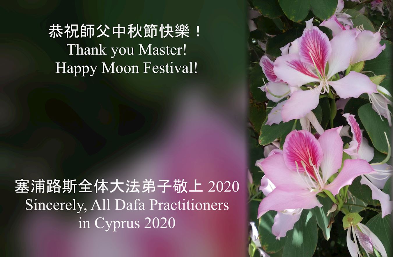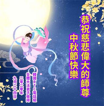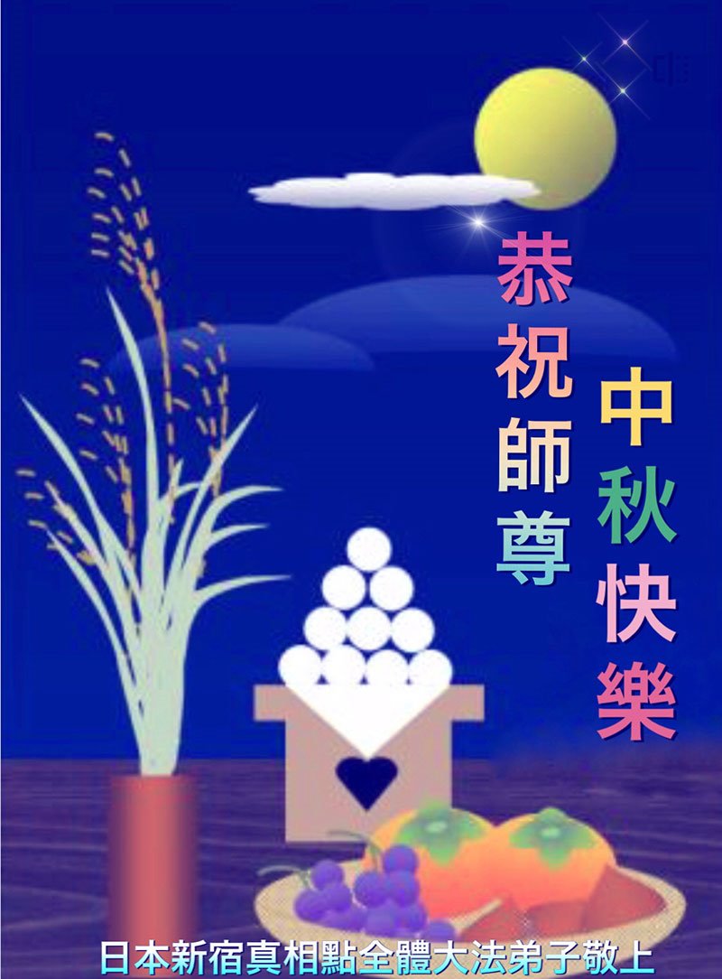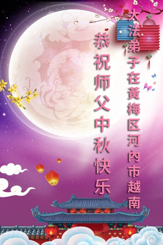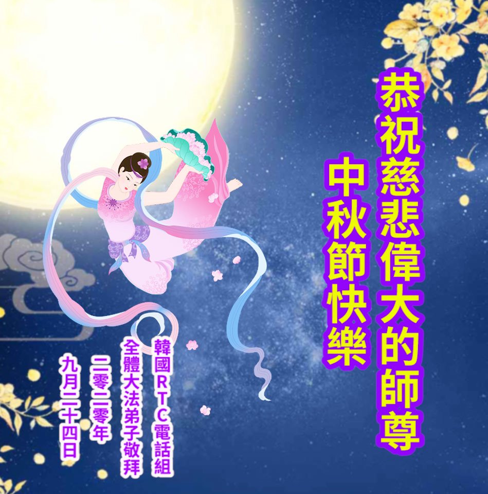 【明慧网二零二零年十月一日】明月何皎皎 合十问师好 末劫大难到 世人不知险 真相解迷雾 救众脱深渊 师笑众生还 天阙舞新莲在2020年中秋佳节之际,世界各国、坚守于各地洪传大法、讲真相的大法弟子们叩谢师父!恭祝师父中秋节快乐! 以下为部份来自美国、瑞典、马来西亚、日本、越南、秘鲁、加拿大、芬兰、巴西利亚、奥地利、俄罗斯、德国、英国、比利时、捷克、斯洛伐克、韩国、法国、荷兰、台湾、印度尼西亚、以色列、澳大利亚、新西兰、瑞士、乌克兰、西班牙、塞浦路斯等各国各地区的大法弟子敬献师尊的中秋贺词。“我们会勇猛精進学好法,修好自己,同化大法,做好大法弟子的三件事,兑现誓约,不辜负师尊的慈悲救度!” 西班牙全体大法弟子恭祝慈悲伟大的师父中秋快乐!美国纽约全体大法弟子恭祝师尊中秋快乐!捷克和斯洛伐克全体大法弟子恭祝慈悲伟大的师尊中秋节快乐!全体以色列大法弟子恭祝师父中秋节快乐!韩国RTC电话组全体大法弟子恭祝慈悲伟大的师尊中秋快乐!日本新宿真相点全体大法弟子恭祝师尊中秋节快乐!纽约时代广场真相小组大法弟子恭祝师尊中秋节快乐!中秋节到了,弟子恭祝师尊节日快乐!在正法的最后时刻,珍惜这所剩不多的时间,做好弟子该做的一切,是师尊对我们的期望,弟子珍惜这一切! 俄罗斯大法弟子恭祝慈悲伟大的师尊中秋节快乐! 秘鲁大法弟子恭祝师尊中秋节快乐!