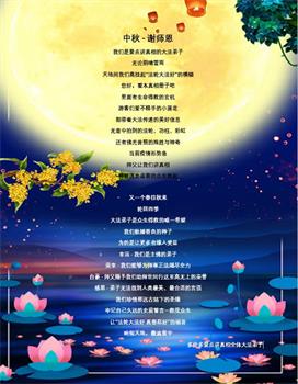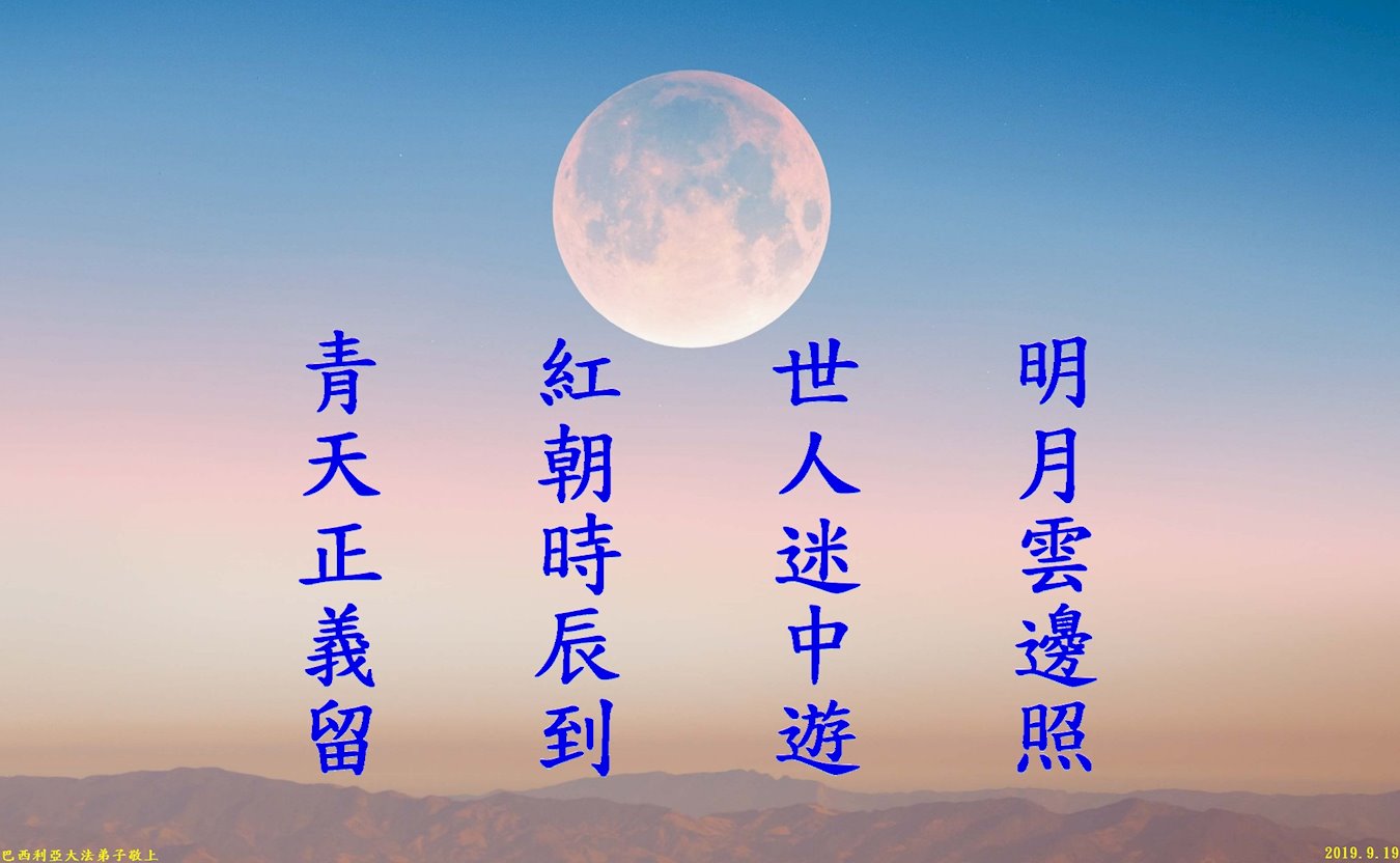 加拿大多伦多景点讲真相大法弟子恭祝师父中秋快乐!美国爱达荷州大法弟子恭祝师尊中秋快乐!马来西亚丹绒马林大法弟子恭祝慈悲伟大的师尊中秋节快乐!日本久喜新学员学法小组大法弟子恭祝师尊中秋好!越南河内市黄梅区大法弟子恭祝师父中秋快乐!加拿大卡尔加里大法弟子敬祝师尊中秋快乐!芬兰大法弟子全家恭祝慈悲伟大的师父中秋快乐!弟子唯有精進实修才能不负师父慈悲救度!芬兰大法弟子全家跪拜! 巴西利亚大法弟子恭祝师父中秋节快乐!奥地利格拉茨全体大法弟子恭祝师尊中秋快乐!奥地利格拉茨全体大法弟子感恩师尊的慈悲保护!我们会勇猛精進学好法,修好自己,同化大法,做好大法弟子的三件事,兑现誓约,不辜负师尊的慈悲救度! 俄罗斯大法弟子恭祝慈悲伟大的师尊中秋节快乐!俄罗斯大法弟子恭祝慈悲伟大的师尊中秋节快乐!希望师父多一些欣慰,少一些辛劳。叩拜师尊的洪恩浩荡!在这月圆人团圆的节日里,弟子也回忆起了自己真正的家园,可能归期已不远,所以内心无比雀跃。只希望将来回想起自己走过的路时能少一些遗憾。谢谢师父的悉心教导和慈悲看护,千言万语道不尽,叩谢师恩! 日本关西地区大法弟子恭祝师尊中秋节快乐!美国亚利桑那州大法弟子叩拜恭祝师尊中秋节快乐!德国斯图加特大法弟子恭祝师尊中秋节快乐!感恩师父慈悲救度!佛恩浩荡!恭祝师父中秋快乐! 英国大法弟子及家人恭祝师尊中秋节快乐!全体瑞典大法弟子恭祝慈悲伟大的师尊中秋快乐!比利时法轮大法弟子恭祝师尊中秋快乐!奥地利全体大法弟子恭祝师尊中秋快乐!芬兰大法弟子祝师父中秋快乐!韩国济州岛大法弟子恭祝慈悲伟大的师尊中秋好!日本埼玉县一家族恭祝慈悲伟大的师父中秋快乐!纽约飞天大学工程部学法组全体大法弟子恭祝师尊中秋快乐!感恩师尊对弟子们的无量慈悲,感恩师尊对众生的洪大胸怀,感恩师尊金刚永恒的大法。弟子们叩拜:恭祝伟大的师尊节日快乐!感恩师尊!谢师尊! 新西兰奥克兰腰鼓队大法弟子恭祝师父中秋快乐!中秋佳节好!希望.之声健康栏目全体大法弟子恭祝师尊中秋节快乐!纽约大.纪.元;媒体一大法弟子恭祝伟大的师父中秋节快乐!在救人的最后关健时刻,弟子一定勇猛精進,学好法,修好自己,救更多的众生,让师父少一份操劳,惟愿师尊笑! 弟子叩拜师父! 荷兰大法弟子一家祝师尊中秋快乐!花好月圆日,中秋喜相逢。 得法廿四载,师恩留心间。 疫情救人急,弟子誓必成。 修炼志如初,他日神位还。 台湾花莲全体大法弟子恭祝师尊中秋快乐!叩拜谢师恩!明月何皎皎 合十问师好 末劫大难到 世人不知险 真相解迷雾 救众脱深渊 弟子再精進 须臾不敢忘 大法正乾坤 法光耀新宇 师笑众生还 天阙舞新莲 印度尼西亚的青年大法弟子恭祝慈悲伟大的师父中秋节快乐!慈悲伟大的师父好!弟子代表全家恭祝师父中秋节快乐!谢谢师父对弟子和弟子全家的慈悲看护和加持!我们一路走来,放下了很多执着与人心。不管未来的路怎么样,还是要稳住心继续做好,抓紧修炼自己,做好该做的。弟子需要加强自身的修炼,尽快跟上正法進程,不辜负师父的期望。 弟子想念慈悲的师父!谢谢师父!叩拜师尊! 澳大利亚悉尼Chatswood学法小组全体大法弟子恭祝慈悲伟大的师尊中秋快乐!新西兰大法弟子恭祝师尊中秋节快乐!新泽西全体大法弟子恭祝慈悲伟大的师尊中秋快乐!美国大费城全体大法弟子恭祝师尊中秋快乐!芬兰全体大法弟子恭祝师父中秋快乐!瑞士法语区大法弟子恭祝师尊中秋快乐!全体乌克兰大法弟子恭祝师尊中秋节快乐!加拿大渥太华大法弟子恭祝师尊中秋节快乐!贺中秋 沧桑岁月似水流 五千风云创神州 成住坏灭临危难 寰宇十方神佛忧 师尊正法挡巨难 法徒助师廿一秋 皓月当空明如镜 天涯处处夜如昼 法国全体大法弟子恭祝慈悲伟大的师尊中秋快乐!尊敬的师父您好! 一年一度的中秋佳节来临了,法国大法弟子在这个敬谢神恩的传统节日里向师尊问好,无限感恩师父的慈悲苦度!恭祝慈悲伟大的师尊中秋快乐! 中秋观月·回文 慈辉映月明 宙宇沁德馨 师恩吾念怀 神途路通心 回文 心通路途神 怀念吾恩师 馨德沁宇宙 明月映辉慈 法国大法弟子合十敬祝 庚子年秋 美国休士顿全体大法弟子恭祝师尊中秋节快乐!谢师恩 金秋明月照十方 弟子叩谢师恩长 抓紧救人讲真相 助师正法返仙乡 全球营救平台大法弟子恭祝师尊中秋快乐!日本天国乐团全体大法弟子恭祝师尊中秋节快乐!全球电话平台德国电话讲真相小组全体大法弟子祝师父中秋节快乐!欧洲希望.之声全体大法弟子恭祝师尊中秋快乐!感谢师尊的慈悲救度,在这最后时刻,弟子们要精進实修、做好项目、抓紧救人,不辱使命! 香港沙田炼功点大法弟子恭祝师父中秋节快乐!新!唐!人:泰国记者站敬祝师尊中秋节快乐!纽约腰鼓队全体大法弟子恭祝师尊中秋节快乐!塞浦路斯大法弟子恭祝师尊中秋节快乐!