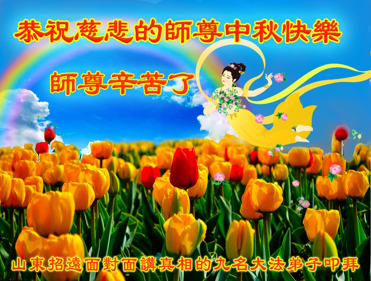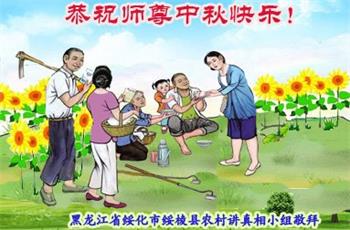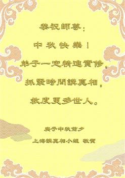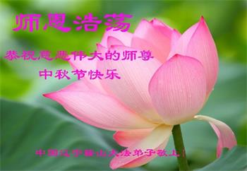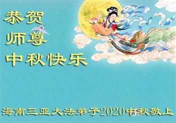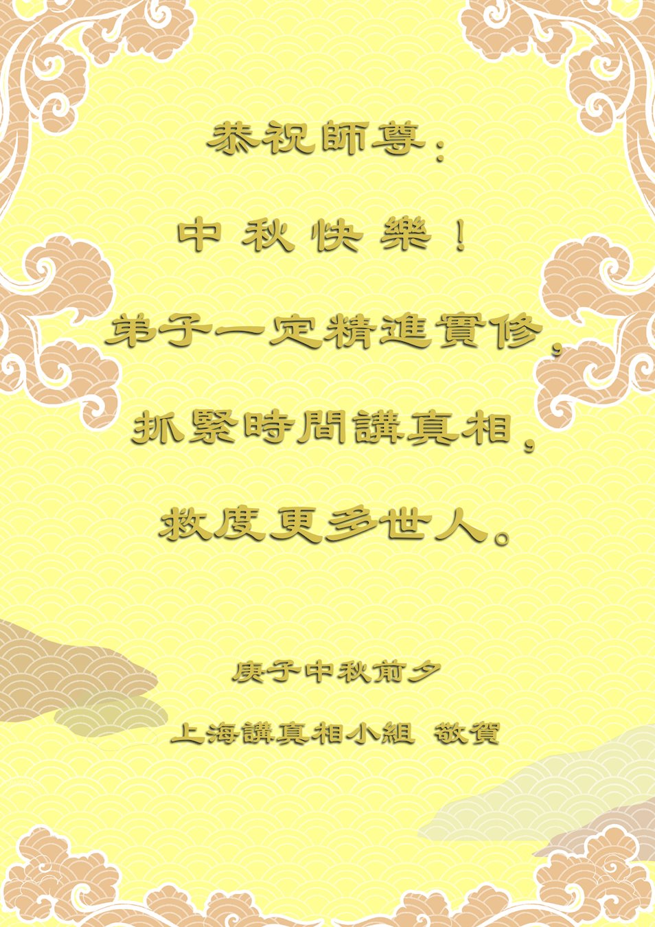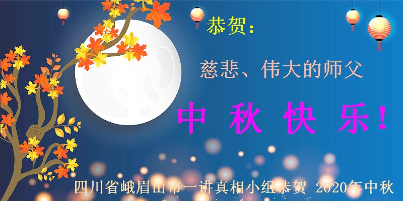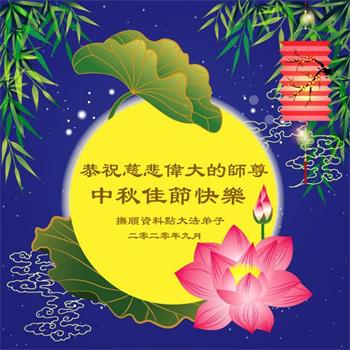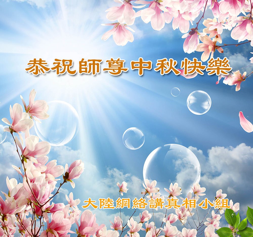 | 【明慧网二零二零年十月一日】中秋佳节之际,在中国大陆冒着被抓、被关押以致生命危险、利用各种方式讲真相救众生的大法弟子们,恭祝师父中秋节快乐! 湖北省天门市资料点大法弟子写道:“风风雨雨走过二十年,在助师正法中,资料点一直发挥着作用。我们深深的知道,我们所做的任何事都是在师父的慈悲保护下才能完成的。” 陕西省汉中市大法弟子说:“弟子每次遇到危险与魔难时,坚定正念除恶,都在师父的保护下化险为夷。慈悲的师尊时时都在保护着弟子。” 四川省讲真相项目组大法弟子转达各行业百姓的反馈:看了大法弟子制作的真相资料,终于理解法轮功了,法轮功确实是在做好事、在救人啊。明真相的教师说,我们真该为法轮功说话了!明真相百姓都请大法弟子转达对大法师父的问候! 新疆喀什地区大法弟子恭祝师尊中秋快乐!师尊的浩荡佛恩,弟子无以为报!弟子唯有谨遵师命,在最后有限的时间里,做好三件事,让更多的生命明白真相,不再受邪*党-毒害,为自己及家人选择一个美好光明的未来!感恩师尊慈悲救度!合十 辽宁省抚顺市资料点大法弟子恭祝慈悲伟大的师尊中秋快乐!谢谢师尊的慈悲救度与保护,使我们走过重重艰险,兑现助师正法救度众生的誓约!师父您辛苦了!弟子们拜谢师恩! 四川省峨眉山一讲真相小组全体大法弟子恭贺师尊中秋快乐!山东省招远市面对面讲真相的九名大法弟子恭祝慈悲伟大的师尊中秋快乐!师尊您好! 我们是常年面对面讲真相的大法弟子。多年的风风雨雨讲真相中,感恩师尊的慈悲保护。师尊为我们铺好了路,处处看护着我们,保护着我们,为了成就弟子,为了众生的得救,不知为我们付出了多少心血,操了多少心。感恩师尊的慈悲救度!我们一定不辜负师尊和众生的期望,认真做好三件事,修好自己,走正走好最后的修炼路,让师尊少操心! 我们受得救的世人委托,在此代他们感谢师父的救度之恩! 陕西省汉中市大法弟子恭祝慈悲伟大的师尊中秋节快乐!师父!弟子叩谢师尊的慈悲救度! 弟子每次遇到危险与魔难时,坚定正念除恶,都在师父的保护下化险为夷。慈悲的师尊时时都在保护着弟子。弟子唯有按师父的要求做好三件事,坚持面对面讲真相多救人,不负众生的期盼,完成自己的使命。 哈尔滨市阿城区发资料小组大法弟子恭祝慈悲伟大的师尊中秋快乐!山西省晋城市一讲真相项目组大法弟子恭祝慈悲伟大的师尊中秋快乐!四川省讲真相某项目组全体大法弟子恭祝慈悲伟大的师父中秋节快乐!我们项目组收到了一些众生的反馈,他们当中有警察、有教师、有公交车司机等不同身份的民众。他们说,看了我们制作的真相资料后,终于理解法轮功了,法轮功确实是在做好事、在救人啊!看了我们的资料觉的很舒心,很踏实,说“你们才是真正的好人!法轮功真的了不起,真的谢谢你们这些大法弟子!”明真相的教师说:“我们真该为你们说话了!终于知道你们大法弟子是在为我们说话、救我们自己。” 他们都让我们代他们问候师父好!感谢师父的救度! 吉林蛟河某讲真相小组大法弟子恭祝师父中秋快乐!河北邯郸一真相小组全体大法弟子恭祝慈悲伟大的师尊中秋节快乐!甘肃天水麦积区二人讲真相小组大法弟子恭祝师尊中秋快乐!黑龙江省牡丹江市海林市三人讲真相小组恭贺师尊中秋节快乐!师尊辛苦了!师父为弟子们操尽了心,弟子无以言表,只有精進实修以报师恩。 叩拜恩师! 广西陆川县全体大法弟子衷心祝愿慈悲伟大的师父中秋快乐!我们跟随师父正法走过了一个个中秋,我们真切的感到佛恩浩荡,在助师正法的路上,我们会紧跟师父,听师父的话,用心学法,去除各种观念执著,多救人,完成使命,走正走好师父安排的路,跟师父回家! 我们想念师父!盼望早日见到师父! 辽宁鞍山一小资料点的大法弟子及家人恭祝慈悲伟大的师尊中秋节快乐!师父您辛苦了,弟子叩谢师尊!我代表我和我的家人感恩伟大师尊的慈悲苦度,弟子想念您!弟子只有更加精進实修,做好三件事,以报师恩。 河南省濮阳市中原油田项目组大法弟子跪恭祝师尊中秋快乐!我们要多学法,正念正行,互相配合做好三件事,不辜负师尊慈悲救度。 黑龙江省绥化市绥棱县农村讲真相小组大法弟子恭祝师尊中秋快乐!大陆网络讲真相小组大法弟子恭祝师尊中秋快乐!辽宁省鞍山市一项目组大法弟子恭祝师尊中秋节快乐!上海市一讲真相小组大法弟子恭祝师尊中秋快乐!弟子一定精進实修,抓紧时间讲真相,救度更多世人。 上海市一讲真相小组大法弟子敬贺 庚子中秋前夕 山西大同一真相资料点的大法弟子恭祝师尊中秋快乐!师尊啊,伟大的师尊,弟子无法用语言描述对师尊的感恩与礼赞。 苍宇因您的慈悲而重生,众生因您的洪恩而得救。 念师尊 感恩无限 银河飞渡 撷天上莲 捧与师尊前 长叩首 人间几十年 正法一瞬间 苍宇崩裂前力挽狂澜 恭祝师尊中秋笑开颜 云南省昆明市三个学法小组大法弟子恭祝师尊中秋快乐!月缺月圆二十八个春夏秋冬,师尊为拯救大穹众生,夜以继日的辛劳,操尽了心。为没跟上正法進程的大法弟子,您承受着巨难,一次又一次延长正法结束的时间。人的语言无法表达师尊的伟大!感恩师父的慈悲苦度! 在这最后的关键时刻,弟子会更加精進,不辜负师父的期望,做好三件事,兑现誓约,圆满随师还。 叩谢师尊! 云南省昆明市三个学法小组全体大法弟子 二零二零