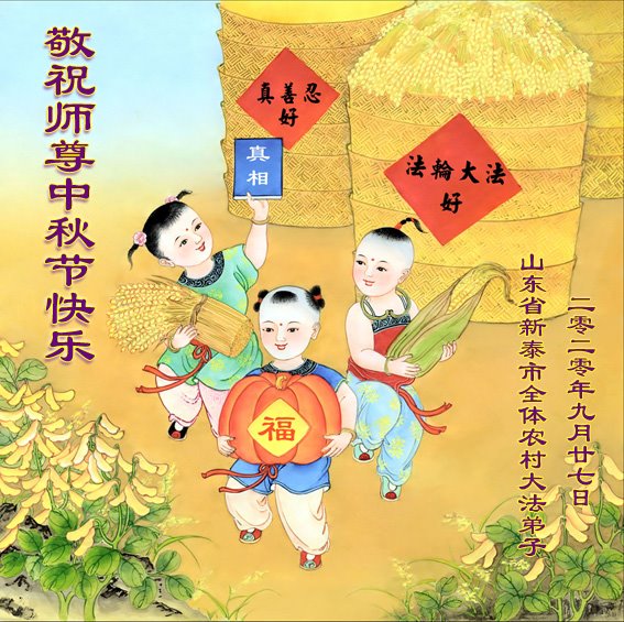 2020年中秋佳节已到,在这金秋佳时,我们农村大法弟子以真诚的心愿,祝师尊中秋佳节快乐!感恩师尊的慈悲苦度。 全体大法弟子一定不负师尊所盼,在正法路上走好走正,精進实修,整体大法弟子跟师父回家。 德州陵城区农村全体大法弟子叩拜恩师 二零二零年九月二十八日 黑龙江省哈尔滨市宾县农村一家五口大法弟子恭祝师尊中秋快乐!