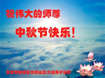 北京市丰台区一修炼之家恭祝慈悲伟大的师尊中秋节快乐! 感恩师尊慈悲救度,让真善忍的光辉照亮了全世界,恩泽万物,弟子们唯有好好修炼,做好三件事,才能完成史前誓约,回报师尊救度之恩,跟师父回家。再次跪拜叩谢师恩。 北京天坛大法弟子恭祝师尊中秋快乐!
