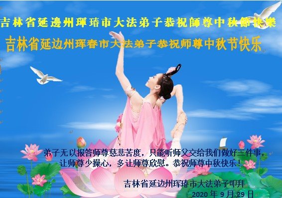 弟子无以报答师尊慈悲苦度,只能听师父交给我们做好三件事,让师尊少操心,多让师尊欣慰。恭祝师尊中秋快乐! 吉林省延边州珲瑃市大法弟子叩拜! 2020年9月29日 吉林省延边大法弟子恭祝师尊中秋节快乐!