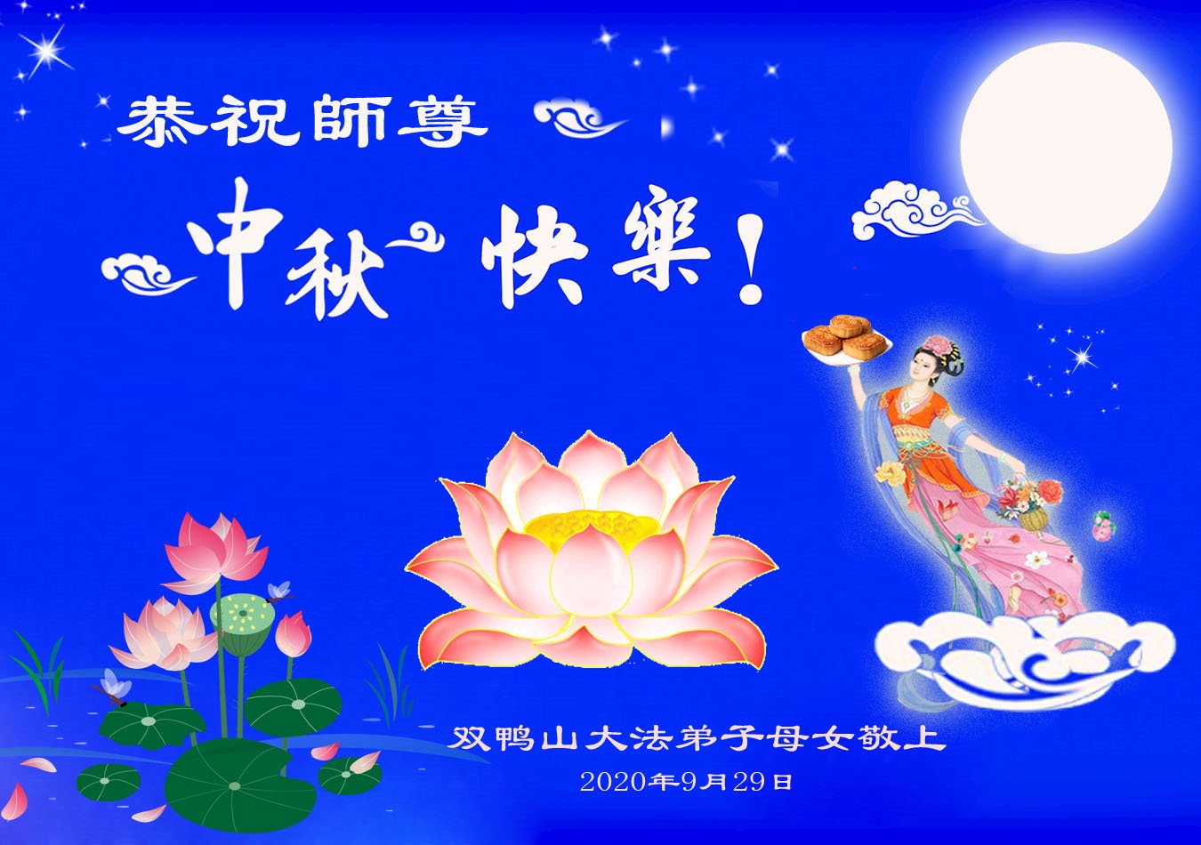 恭祝师尊中秋节快乐!尊敬的师父您辛苦了! 感谢师尊慈悲苦度! 弟子一定做好三件事跟师父回家! 大连开发区一家大法弟子和孙女大法小弟子敬上 合十 2020 年9月29日 |