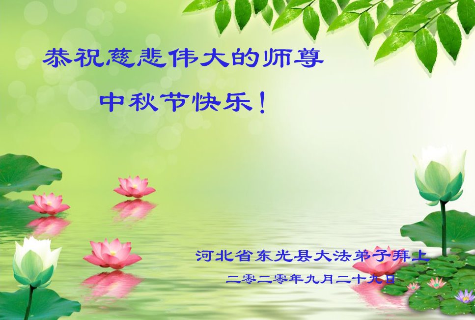 恭祝慈悲伟大的师尊中秋节快乐! 河北省东光县大法弟子敬贺 2020年9月29日 河北省沧州市东光县一大法弟子全家恭祝师父中秋节快乐!