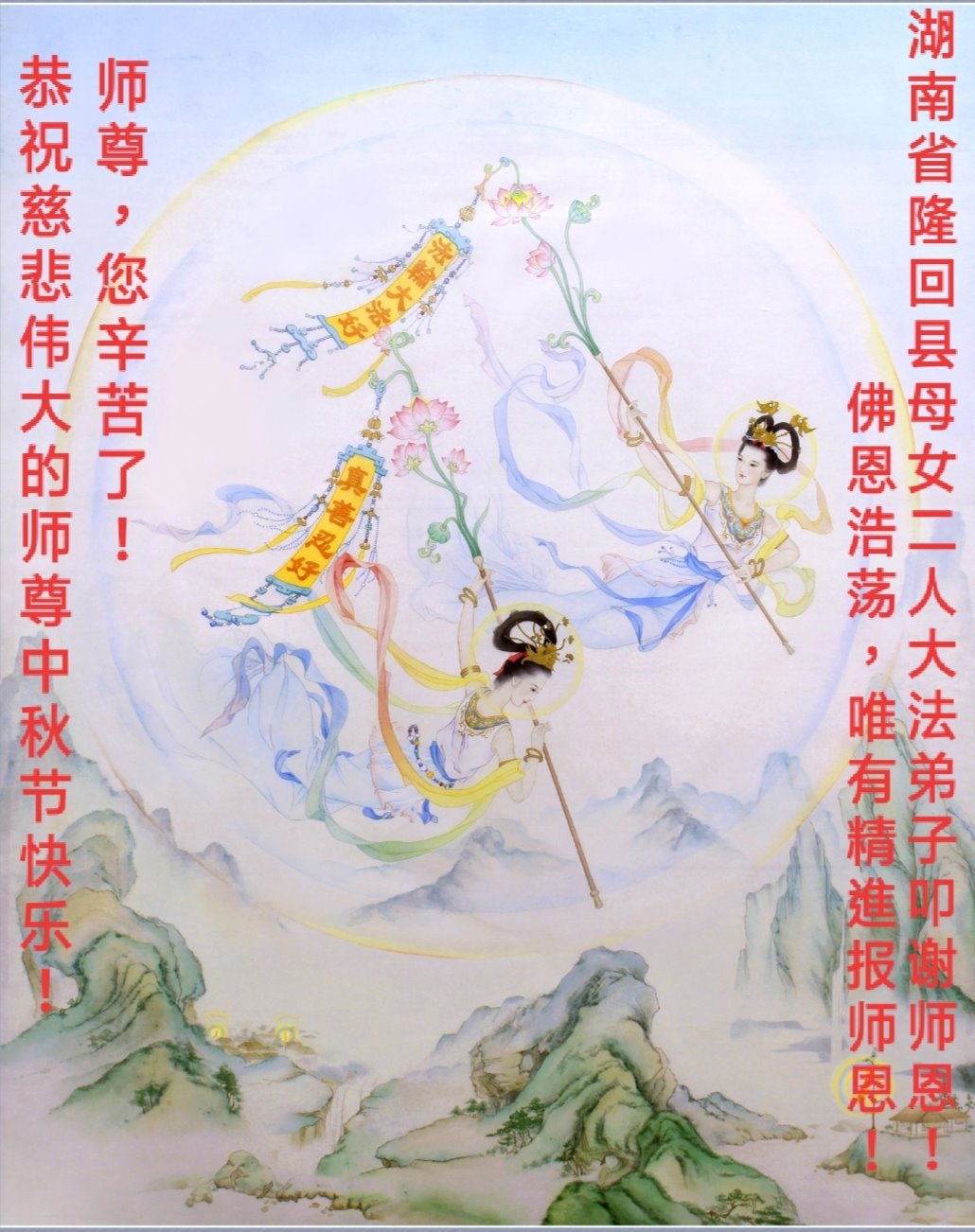 湖南省隆回县母女二人大法弟子叩谢师恩!恭祝慈悲伟大的师尊中秋节快乐! 湖南省益阳市沅江市大法弟子恭祝慈悲伟大师尊中秋节快乐!