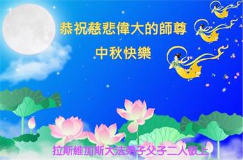 感恩师尊一路慈悲保护!在这正法的最后阶段,弟子们定当勇猛精進,多学法,多向内找,修好自己,配合整体,多救人。惟愿师尊笑! 美国拉斯维加斯大法弟子父子二人恭祝慈悲伟大的师尊中秋快乐!