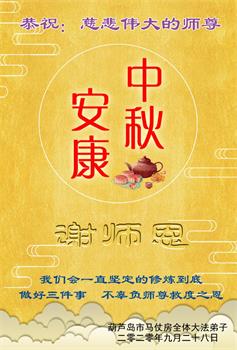 感恩师尊的慈悲救度!珍惜师尊给我延续的生命,坚定实修,做好三件事。叩谢师尊洪恩! 绥中一学法小组大法弟子恭祝师尊中秋节快乐!