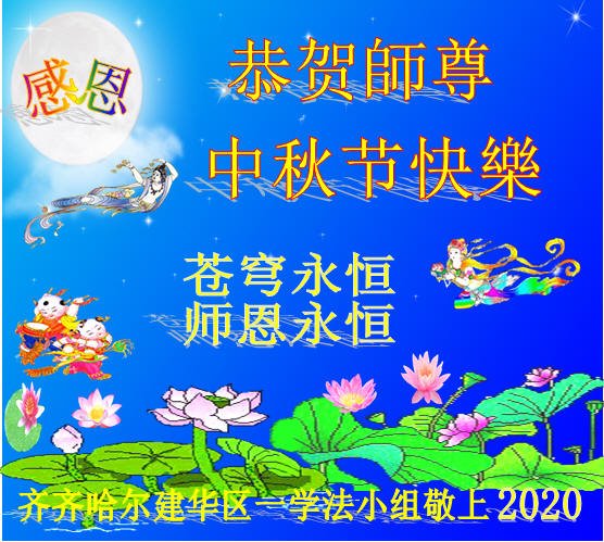 又是一年皓月当空月圆之时,每逢佳节倍思亲,弟子们想念师父! 恰逢大法弘传,是弟子和世人的幸福和荣耀,感恩师父的救度。在师父给延续的救人时间里,弟子必须学会向内找,去掉根本的执着、名利情,踏踏实实做好三件事。弟子们会正念正行,信师信法,时刻把师父的法装于心中:“苍穹无限远 移念到眼前 乾坤无限大 法轮天地旋”。(《洪吟》<洪>)师父时时都在我们身边。 黑龙江省齐齐哈尔讷河市全体大法弟子 2020中秋敬上 黑龙江省齐齐哈尔市龙沙区二人大法弟子恭祝师尊中秋节快乐!
