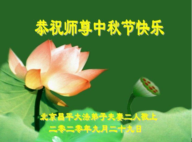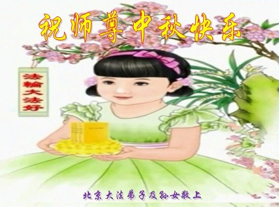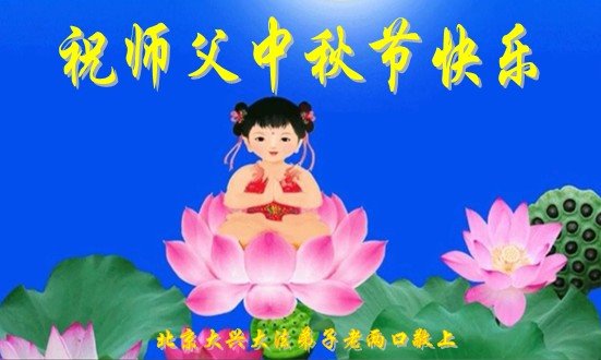 我们好好学大法,听师父的话,真心念法轮大法好!真善忍好!坚持学法,再次祝师父中秋节快乐! 北京大兴大法弟子老两口敬上 北京市大法弟子恭祝师尊中秋快乐!