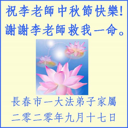 我们全家五人向法轮功创始人李大师致以节日问好!您辛苦了!我们都明白真相,支持大法。谢谢救度! 河南大法弟子家属恭祝李大师中秋节快乐!