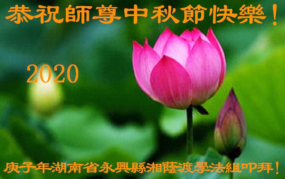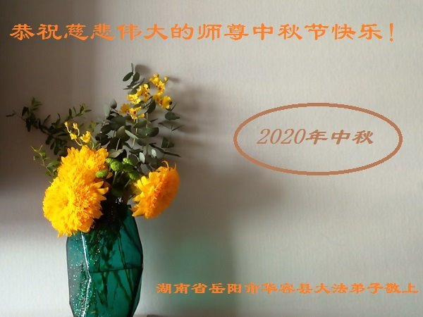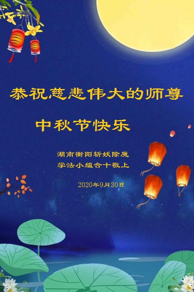 师尊您好!中秋节快到了,“每逢佳节倍思亲” 弟子非常想念师尊! 感谢师尊对我分分秒秒的慈悲保护!感恩师尊的慈悲救度!惟愿师尊笑! 师尊盼弟子精進、圆满回家。在这正法时期的最后时刻,弟子会谨遵师命,“修炼如初道必成!越到最后越精進!”我一定不辜负师尊对我的殷切期望,精進实修,兑现誓约。 祝师父节日快乐!弟子跪拜师尊。 2020年9月28日星期一 湖南岳阳市一大法弟子恭祝师尊中秋快乐!