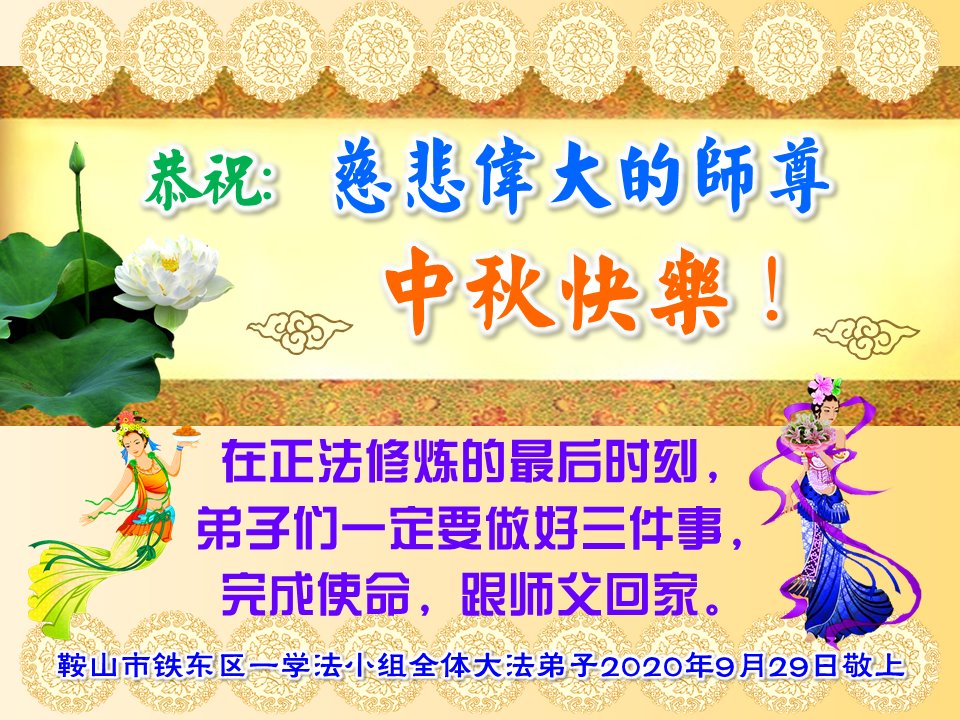 在正法修炼的最后时刻,弟子们一定要做好三件事,完成使命,跟师父回家。 鞍山市铁东区一学法小组全体大法弟子 2020年9月29日敬上 辽宁阜新大法弟子恭祝中秋佳节师父好!