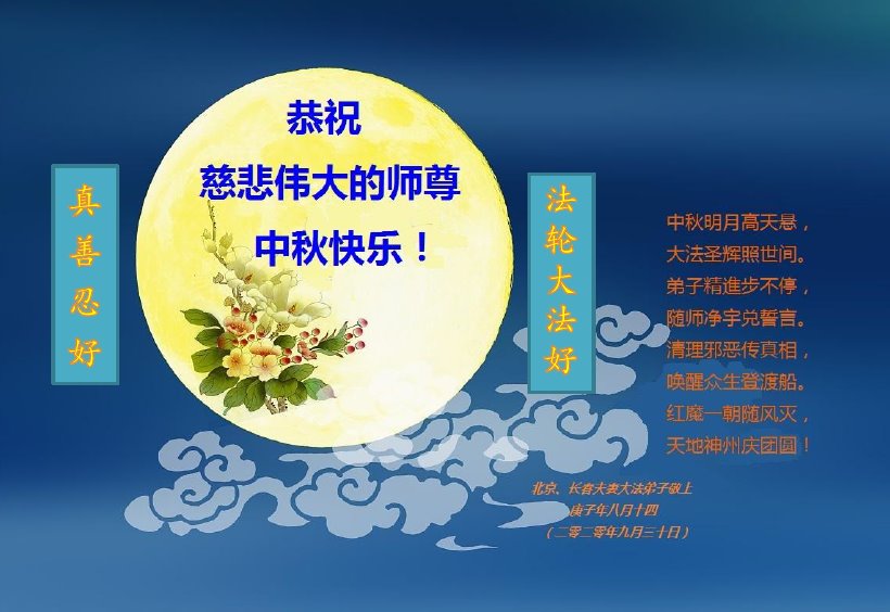 弟子无以回报恩师,只有精進实修,用大法洗净身心,做好三件事,在师尊安排的路上走正走好,让师尊少一份操劳。 北京朝阳大法弟子祝师父中秋节快乐!