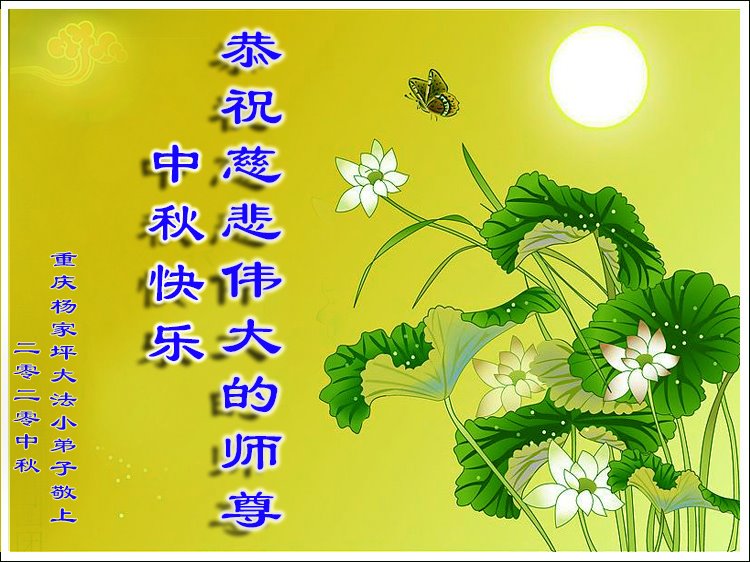 师父好,师父辛苦了!弟子想念师父,感恩师父浩荡洪恩。 我们听师父的话,时时向内找,修好自己,做好三件事,坚定修炼,完成史前誓约,达到正法圆满标准,让师父多一点欣慰,少一点操劳。谢谢师父慈悲洪恩。师父辛苦了。弟子叩拜师尊。 重庆合川一大法弟子恭祝师父中秋节快乐!