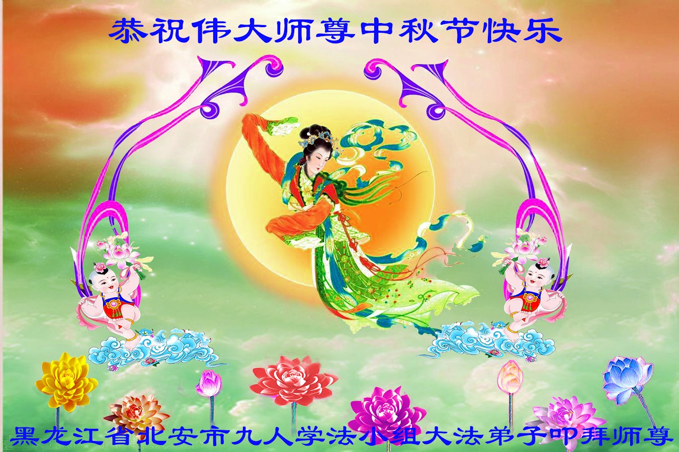黑龙江省黑河市北安市九人学法小组大法弟子叩拜师尊 黑龙江省黑河市北安市一大法弟子恭祝伟大师尊中秋节快乐!