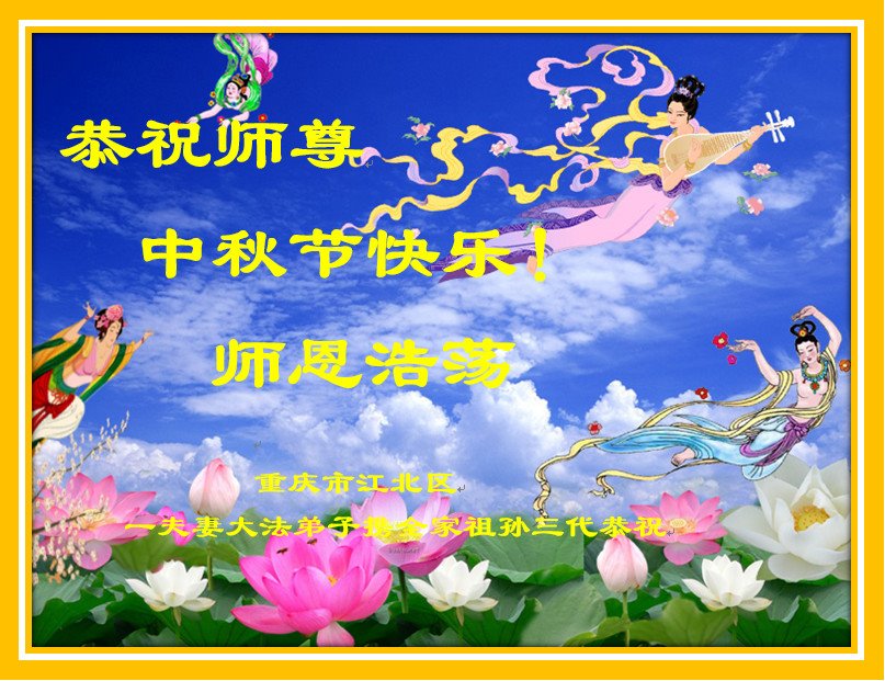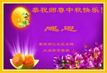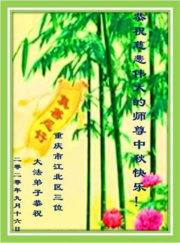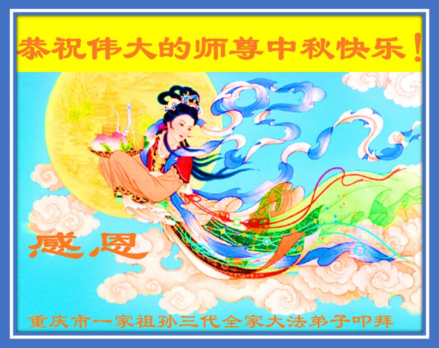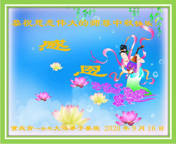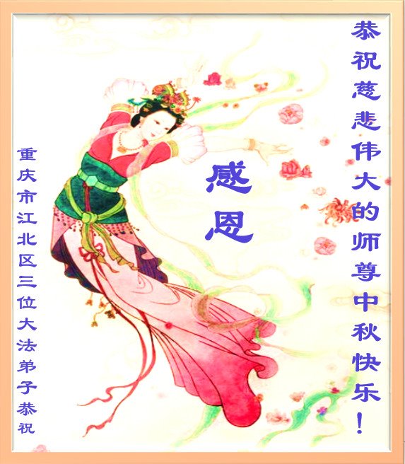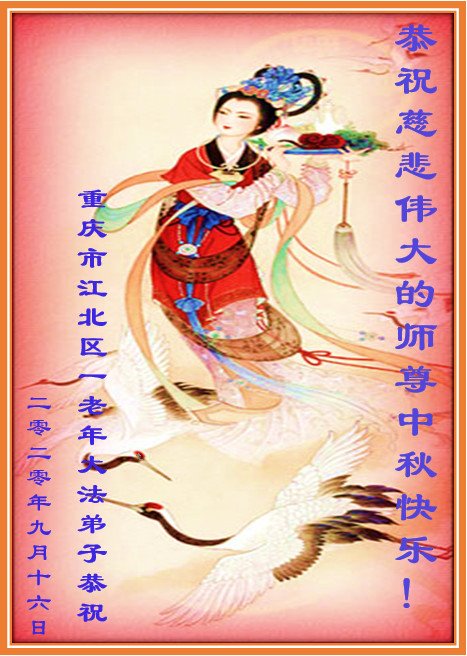 师尊您好, 师尊辛苦了!中秋月圆人团圆,每逢佳节倍思亲,弟子想念师尊!在这中秋佳节即将来临之际,弟子跪拜师尊,恭祝慈悲伟大的师尊中秋快乐!是师尊的恩泽使万物归正、众生得救,师恩浩荡。弟子牢记师尊的教诲,请师尊放心,弟子一定要学好法,修好自己,讲真相多救人,不辜负师尊慈悲苦度,圆满随师还!叩谢师尊! 重庆市江北区一老年大法弟子恭祝慈悲伟大的师尊中秋快乐!