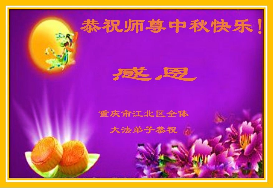 师父辛苦了!师父中秋节好!感恩师父对弟子慈悲苦度!弟子一定学好法,修好自己,抓紧时间多救人,兑现誓约跟师回归家园。 重庆江北区全体大法弟子恭祝师尊中秋节快乐!