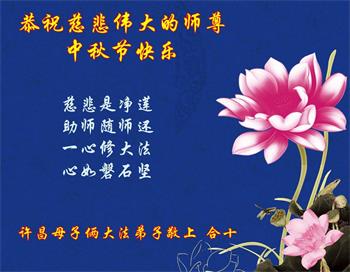 慈悲是净莲 助师随师还 一心修大法 心如磐石坚 许昌母子俩大法弟子敬上合十 海南文昌一大法弟子恭祝伟大慈悲的师父中秋节快乐!
