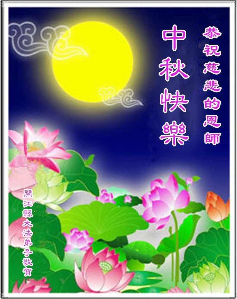 又是一年中秋节,弟子遥拜师尊,师尊辛苦了!感谢师尊把宇宙大法传给弟子,教会弟子做个道德高尚的人,为弟子洗尽罪业,师尊的悲慈用尽人间的语言也道不尽。弟子唯有听师话,做好三件事。 四川省成都市青白江大法弟子敬上 四川省达州市开江县随子女常驻成都龙泉一大法弟子恭祝师父中秋节快乐!