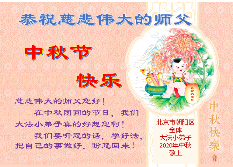 弟子一定听师尊的话,修好自己,做好三件事,兑现誓约,完成使命,圆满随师还。 叩拜师尊! 北京市朝阳区全体大法小弟子恭祝师父2020年中秋节快乐!