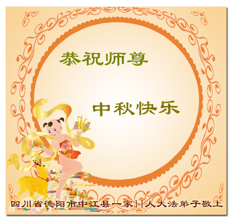 每逢佳节倍思亲,濮阳地区全体大法弟子遥祝师尊中秋节快乐!叩拜师尊!期盼早日能和师尊团聚! 四川省德阳市中江县一家11人大法弟子恭祝慈悲伟大的师尊中秋节快乐!