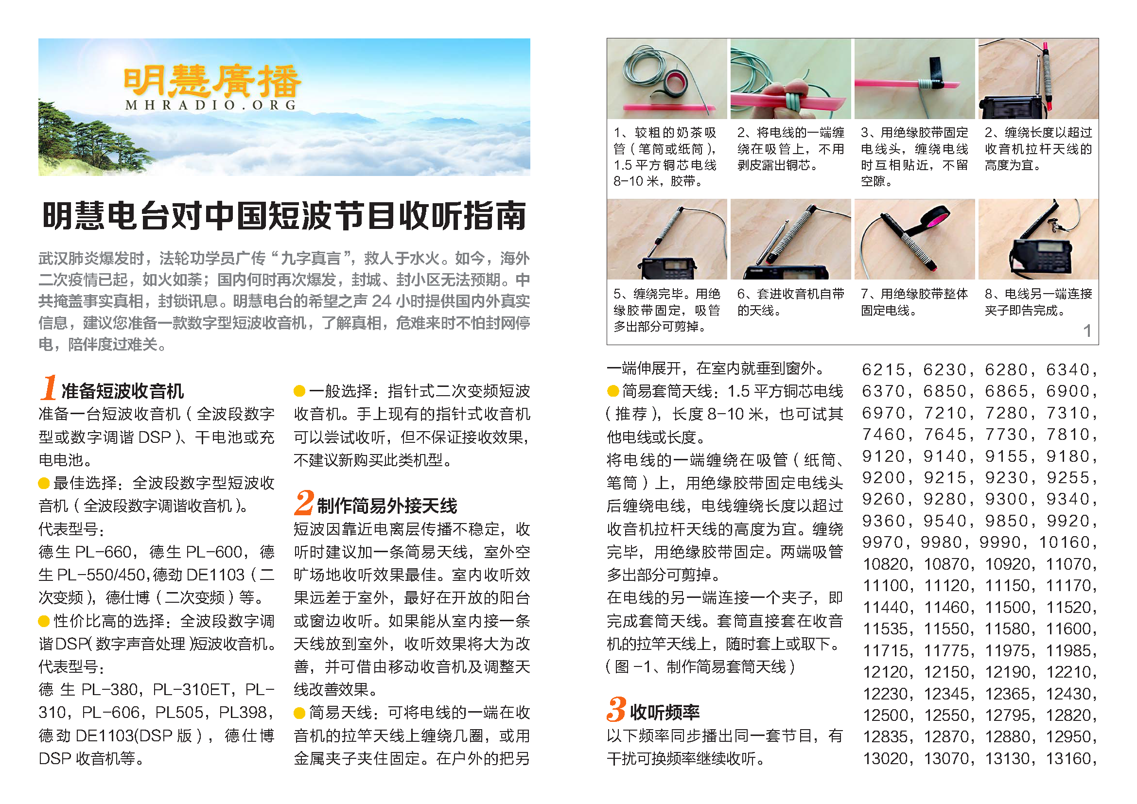 【明慧网二零二零年十月二十日】武汉肺炎爆发时,法轮功学员广传“九字真言”,救人于水火。如今,海外二次疫情已起,如火如荼;国内何时再次爆发,封城、封小区无法预期。中共掩盖事实真相,封锁讯息。明慧电台的希望.之声 24 小时提供国内外真实信息,建议您准备一款数字型短波收音机,了解真相,危难来时不怕封网停电,陪伴度过难关。