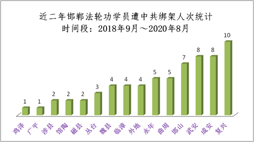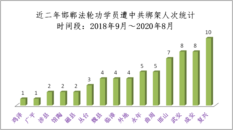 | 地区 | 判刑 | 绑架人次 | 拘留 | 批捕 | 起诉 | 酷刑摧残 | 抢劫抄家 | 敲诈勒索(元) | 流离失所 | 恐吓骚扰 | | 丛台 | 2 | 4 | 2 | 1 | 1 | | 3 | 200 | | 13 | | 邯山 | | 7 | 2 | | | | 1 | | | 2 | | 复兴 | 2 | 11 | 5 | 2 | 1 | 1 | 5 | | | 17 | | 永年 | | 5 | 2 | 1 | | | 5 | 2000 | 1 | 16 | | 武安 | 1 | 8 | 2 | | | | | | | 1 | | 峰峰 | | | | | | | | | | | | 涉县 | | 2 | 1 | | | | 2 | | | 2 | | 成安 | | 8 | 3 | 1 | | | 4 | 3050 | 1 | 4 | | 磁县 | | 2 | 1 | | | | | | | | | 馆陶 | | 2 | | | | | 3 | | 1 | 7 | | 魏县 | 1 | 5 | 3 | 1 | 1 | | 1 | | 1 | 11 | | 大名 | | | | | | | | | | | | 曲周 | | 5 | 3 | 1 | | | 4 | | 1 | 3 | | 邱县 | | | | | | | | | | | | 鸡泽 | | 1 | 1 | | | | 3 | | | 4 | | 临漳 | | 4 | 4 | | | | | | | | | 肥乡 | | | | | | | | | | | | 广平 | | 1 | | | | | | | | | | 外地 | | 4 | 4 | | | | | | | 1 | | 合计 | 6 | 69 | 33 | 7 | 3 | 1 | 31 | 5250 | 5 | 81 |