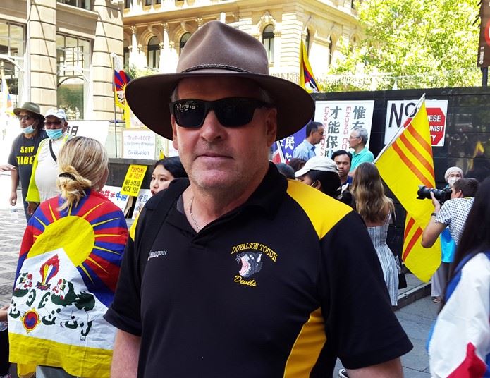 在集会上发言的还有人权维护者、第六代澳洲人雷蒙德·凯利(Raimond Kelly )。今年初当他获悉中共对世界隐瞒武汉病毒真相,导致全世界无数人感染、死亡的巨大灾难后,他曾在悉尼中领馆前手举鞭子在地上愤怒抽打高声疾呼谴责中共。他维护人权的善举被当场拍成录像并被网民广传,瞬息得到无数世人的关注和高度称赞—谴责中共的澳洲勇士。 凯利先生表示:“我支持所有为人权信仰自由而战的人们,特别是我支持刚刚法轮大法发言人提到的,法轮大法修炼者帮助世人了解到他们的善良美好和中共的邪恶本质。在中共露出其真面目威胁澳洲的价值观和自由时,我们应该坚持正义良知,珍惜澳洲的传统价值,不被中共收买,选择与中共分道扬镳,谴责中共,终结中共。” 观众群中有位来自中国江苏的徐先生也是自发人权维护者,他表示:“在中共误导性的谎言宣传和报道下,导致中国人对法轮功持有偏见,中共的作为完全违反了人道。我翻墙看到了各方面的视频,也看了六四的真相,还看了中共造假片“法轮功在天安门广场自焚”的真相,知道这是(中共派)人精心策划制作的,后来我挖掘了更多真相。我觉得法轮功传扬的是一种‘真、善、忍’的大爱。我觉得法轮功学员们在国际上,在反共事业上做出了很大的贡献。他们创办了媒体。我也支持法轮功。” 集会在中午时分结束后,与会澳洲各界人士高举“邪恶中共是人类文明的敌人”、“中共屠夫,必遭天谴”、“支持澳洲政府 反对外国干涉”等标语开始游行。他们从马丁广场出发徒步一个多小时,路径市中心到达悉尼中领馆,沿途引发许多世人对“捍卫天赋人权、谴责和终结中共暴政”的关注和支持。
